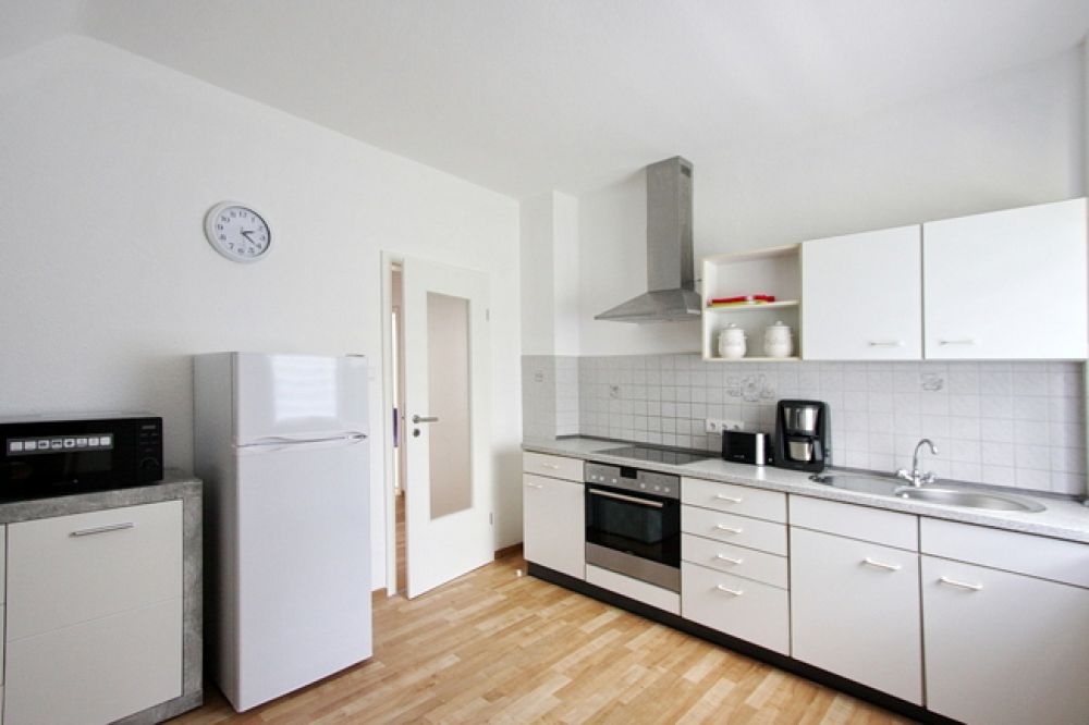 Wohnzimmer mit Zugang zum Balkon mit Blick ins Grüne, Couchecke, Sat-TV. Separates Schlafzimmer mit Doppelbett (2 x 2m). Die Küche ist vollausgestattet: Ceranfeld, Backofen, Dunstabzug, Kühl-Gefrierkombination, Mikrowelle, Kaffemaschine, Toaster , Geschirr und Besteck, Esstisch. Das helle, modern ausgestattete Bad mit Dusche hat Tageslicht. Eine Waschmaschine steht im Keller des Hauses zur Verfügung. Warmmiete inklusive Internet zzgl. Strom, Endreinigung € 90,-. Auf Anfrage steht temporär ein weiteres Zimmer mit Schlafgelegenheit zur Verfügung. PKW-Stellplatz hinter dem Haus auf dem Hof.