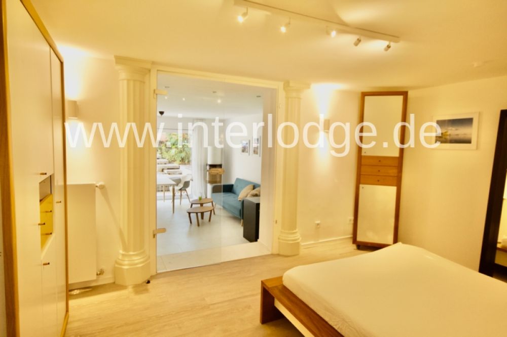 Vom Schlafzimmer schweift der Blick auf die Terrasse und ins Grüne. Das Schlafzimmer verfügt über ein Doppelbett (160x200) und Designer-Schränke