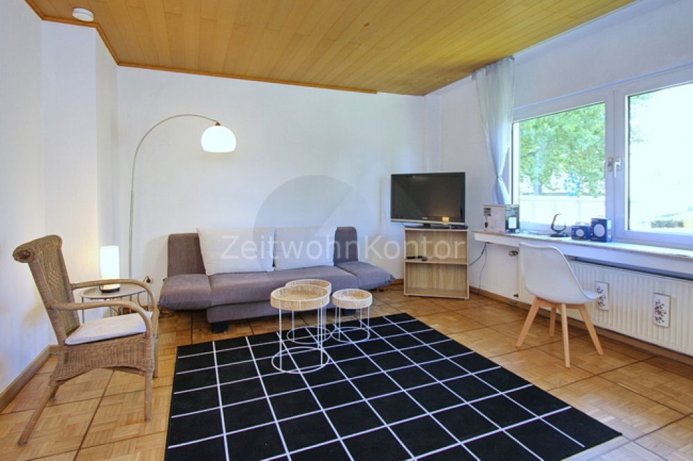 Großes Wohnzimmer mit Couchecke, Arbeitsplatz, WLAN aktiv und Zugang zum Balkon. Separates Schlafzimmer mit Doppelbett, in beiden Räumen sowie in der Diele liegt Parkett.