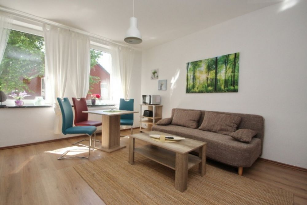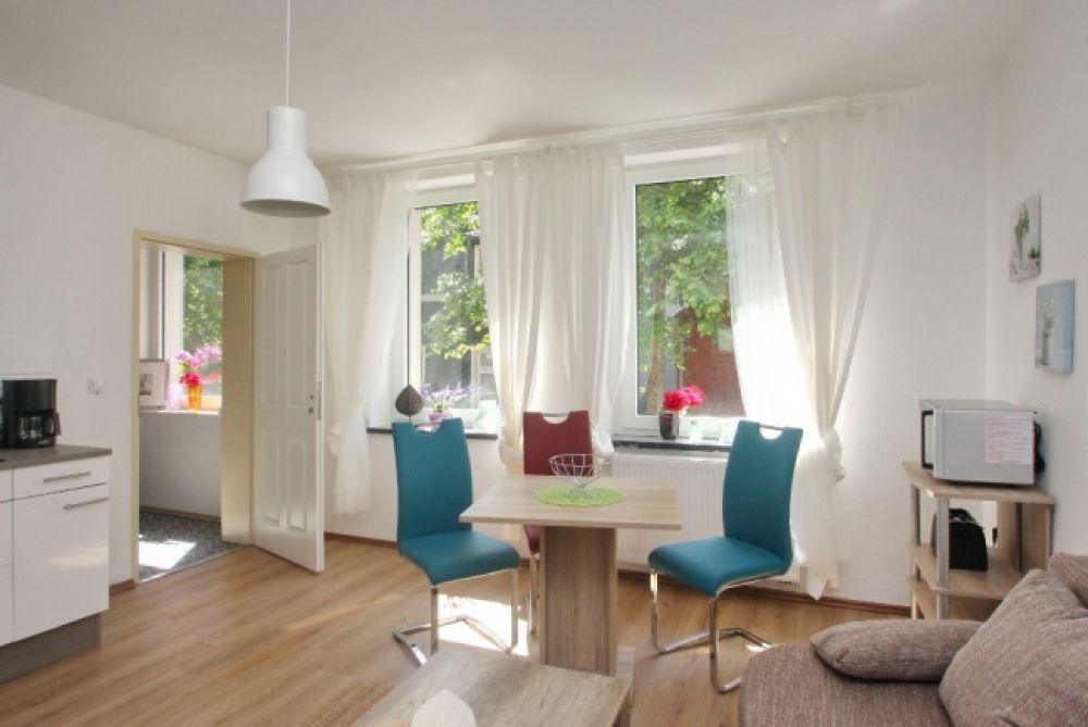 Living room with couch corner (sofa bed 1.80m x 2.00m) and satellite TV, and Wi-Fi (extra) as well as open, fully equipped fitted kitchen with oven, extractor hood, microwave etc. High-quality laminate. The separate bedroom has a large double bed with 2 mattresses, as well as a large sliding door wardrobe with mirror. Modern, white tiled daylight bathroom with bathtub with shower function and its own washing machine.The rent is an all-inclusive rent plus electricity and DSL (250MB) (€ 25,-). Cleaning service can be booked on request. I NON-SMOKING apartment!