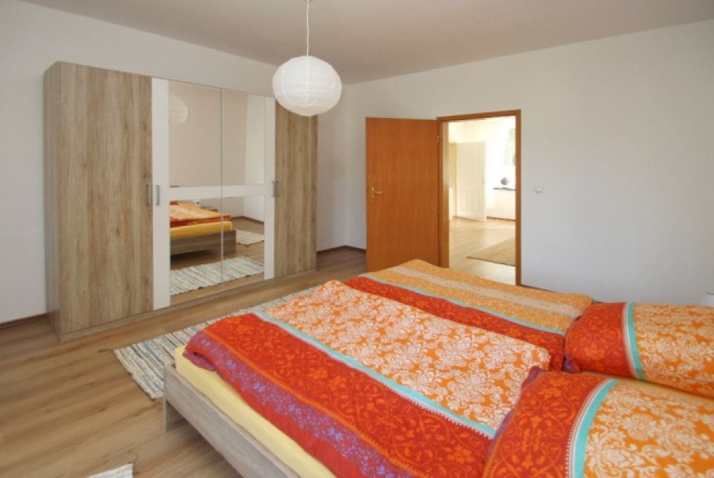 Wohnraum mit Couchecke (Schlafcouch 1,80m x 2,00m) und Sat-TV, und WLAN (extra) sowie offener, vollausgestatter Einbauküche mit Backofen, Dunstabzug, Mikrowelle etc. Hochwertiges Laminat. Das separate Schlafzimmer hat ein großes Doppelbett mit 2 Matrazen, sowie einen großen Schiebetürenschrank mit Spiegel. Modernes, weiß gefliesten Tageslichtbad mit Badewanne mit Duschfunktion und eine eigene Waschmaschine.Die Miete versteht sich als Pauschalmiete plus Strom und DSL ( 250MB ) ( € 25,- ). Reinigungsservice kann auf Wunsch zugebucht werden. Es handelt sich um eine NICHTRAUCHER Wohnung.