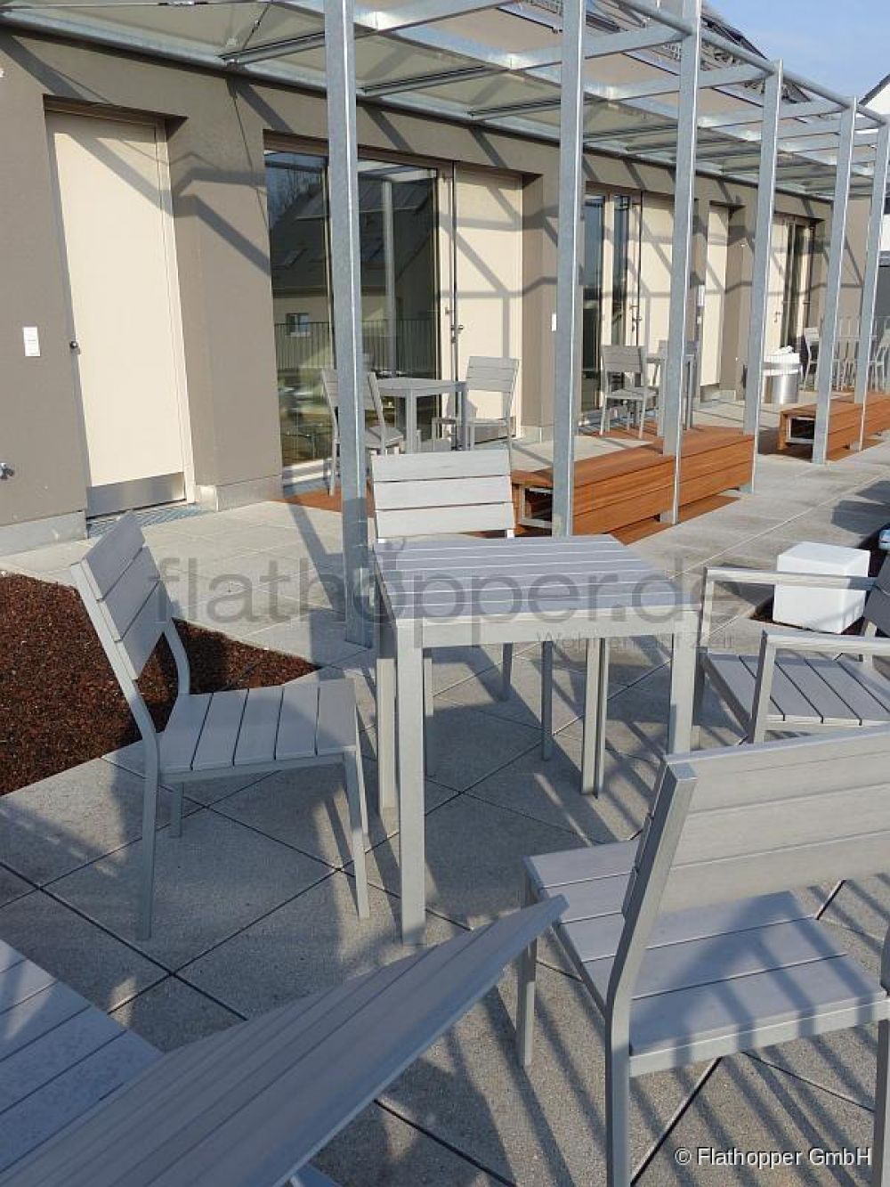 Eine großzügige Wohnung mit 140 m² Grundfläche mit vorgelagerter, überdachter Südterrasse inkl. Sonnenliege und einem Esstisch mit Stühlen.