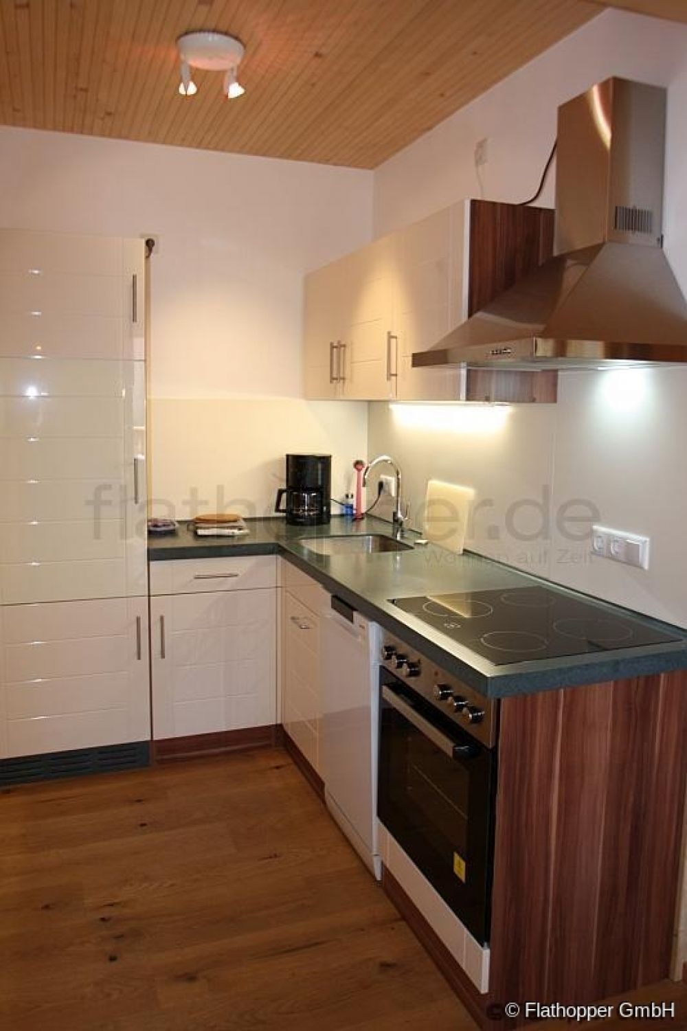 Neue Einbauküche mit Kühl-/Gefrierkombi, Spülmaschine und reichlich Stauraum.
