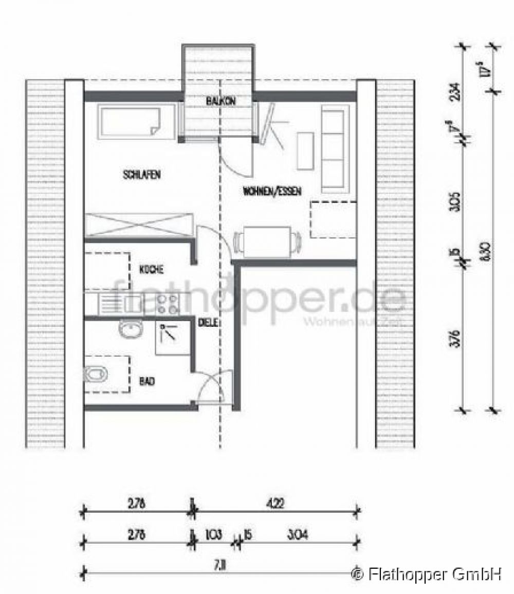 Das Apartment ist sehr geräumig. Der guter Zuschnitt erlaubt eine schöne Abgrenzung zwischen Wohn- und Schlafbereich. Der Zugang zum Balkon führt über den Wohnbereich.