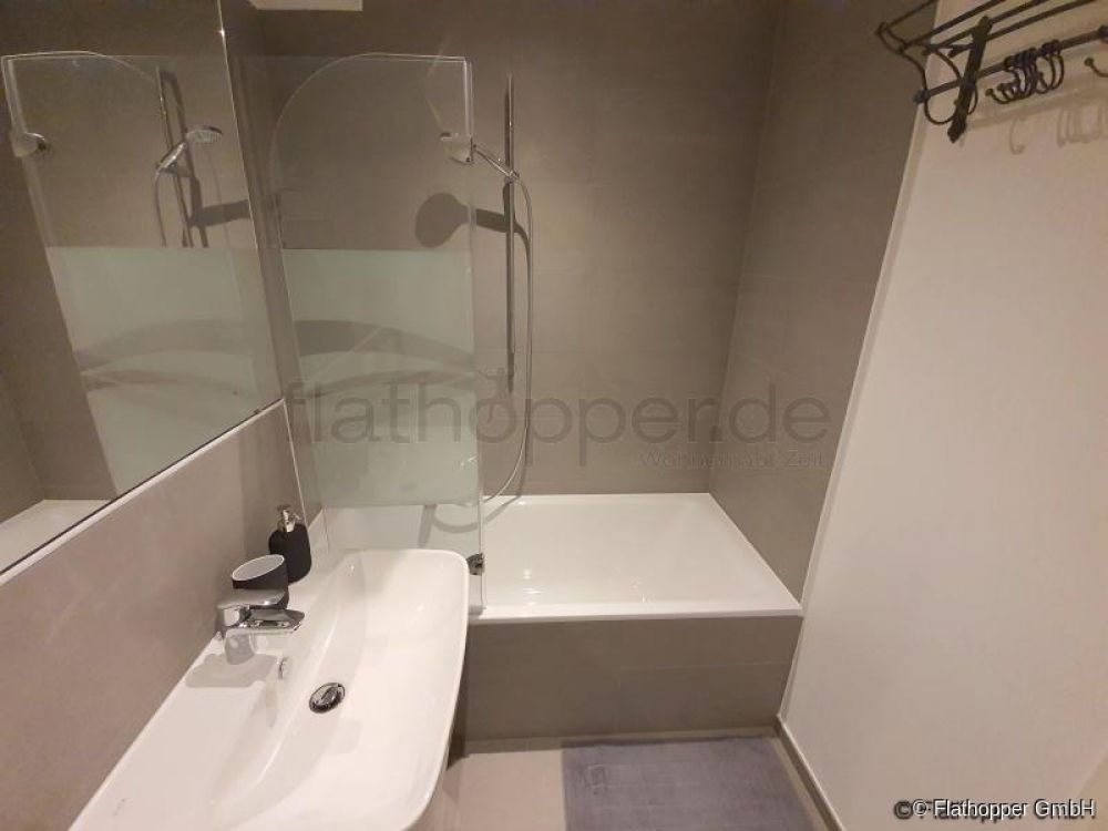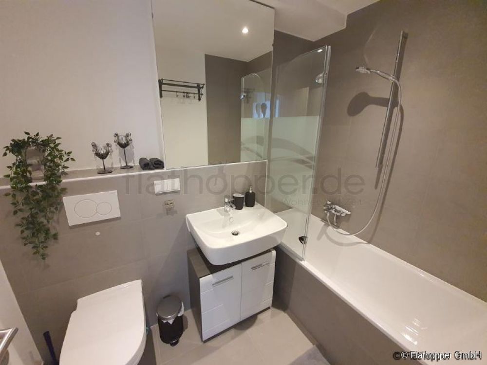 Das Bad beinhaltet eine Badewanne mit Duschfunktion, ist grau gefliest und mit einem großen Spiegel ausgestattet.