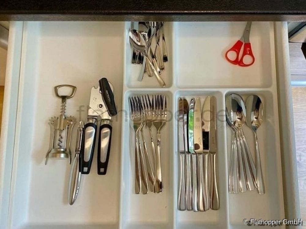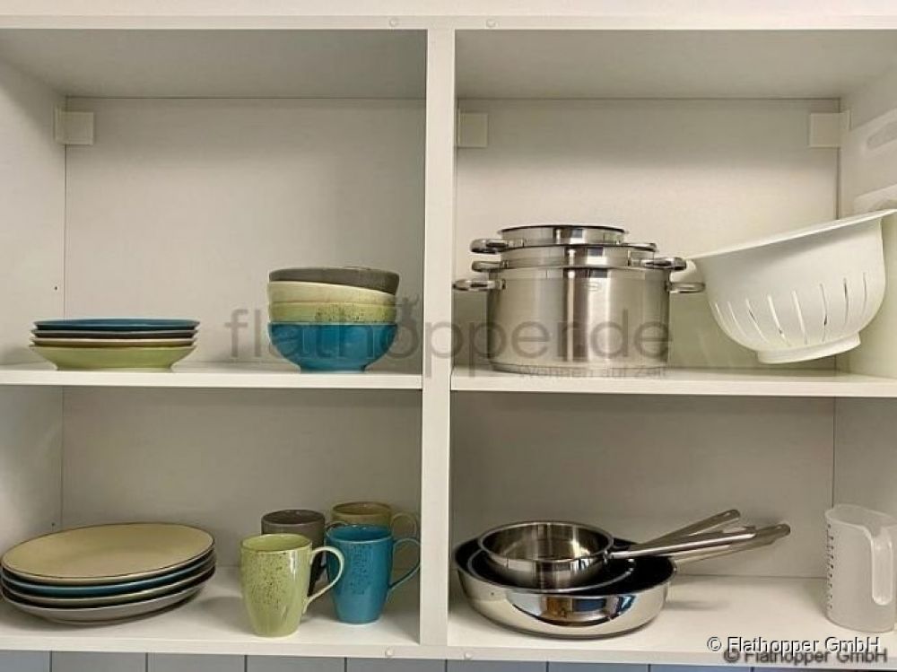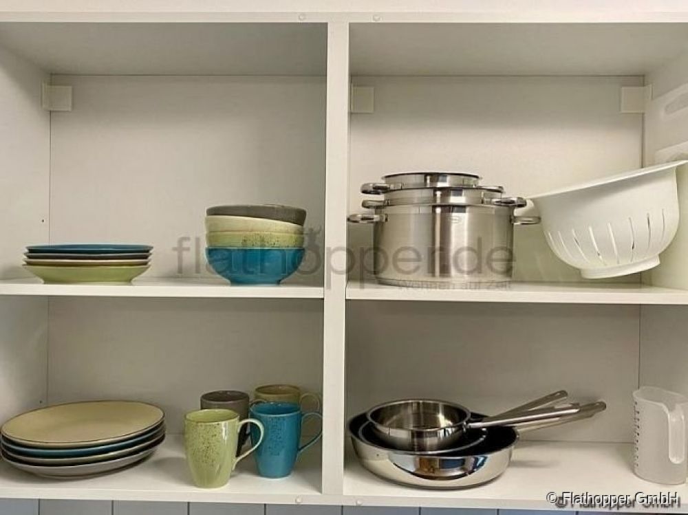 Kochutensilien wie z.B. hochwertige Pfannen, Töpfe, Geschirr, Messerblock etc. sind vorhanden.