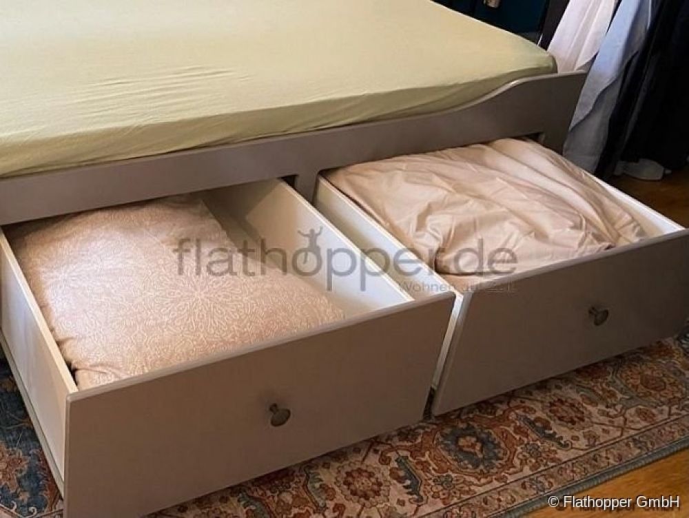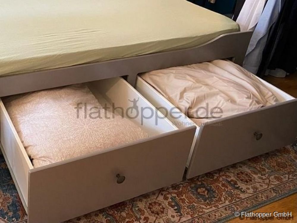 Zudem gibt es noch zusätzlichen Stauraum durch 3 große Schubladen für z.B. die vorhandene Bettwäsche. Das große Bett ist mit einem Handgriff zur platzsparenden Couch umfunktioniert.