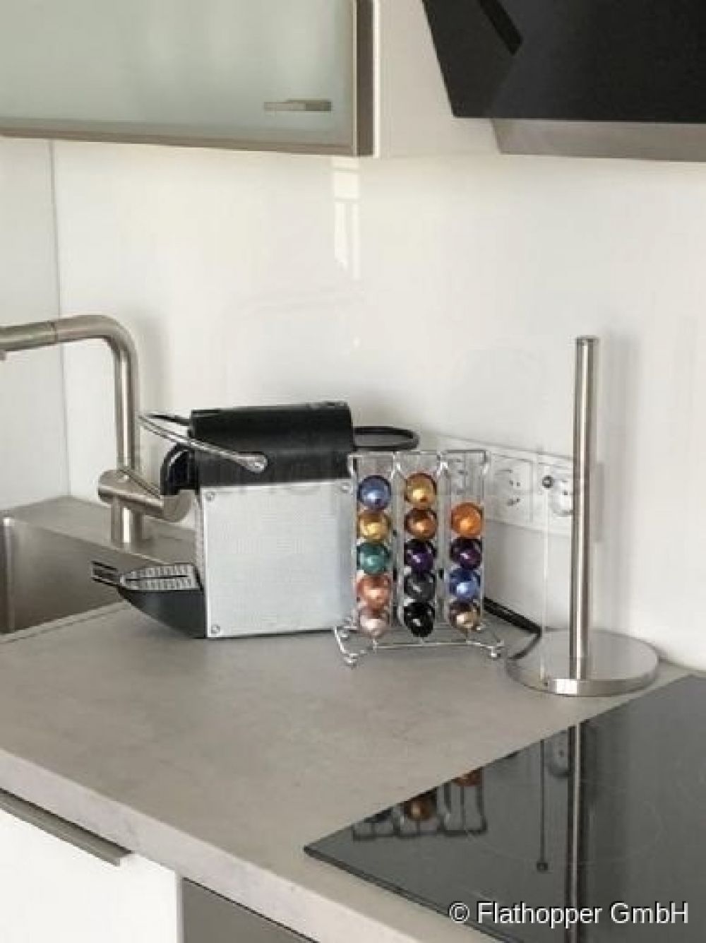 Die offene Küche verfügt über einen Backofen mit integrierter Mikrowelle, Dunstabzug, Induktionskochfeld, Kühlschrank mit Gefrierfach und Spülmaschine. Zudem gibt es Küchenutensilien und Besteck von WMF und Geschirr von Villeroy & Boch.