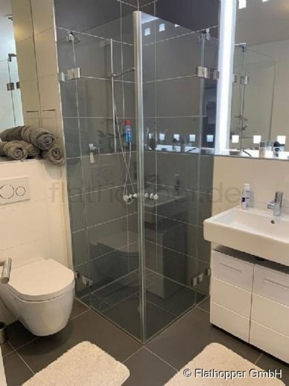 Das Bad ist mit hochwertigen Marken- Sanitäranlagen ausgestattet, wie zum Beispiel einem eleganten Waschtisch mit großflächigen Spiegel, einem Waschtrockner und einem Handtuchheizkörper.