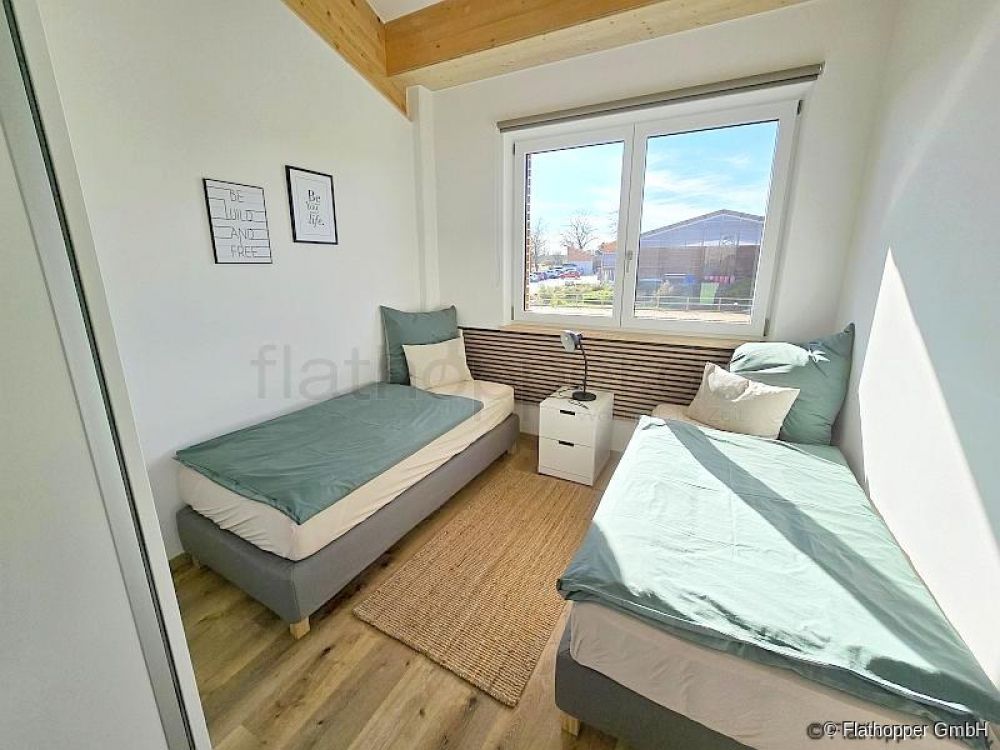 Separates Schlafzimmer mit zwei Einzelbetten, welche auch zusammengeschoben werden können. Kleiderschränke sind vorhanden.
