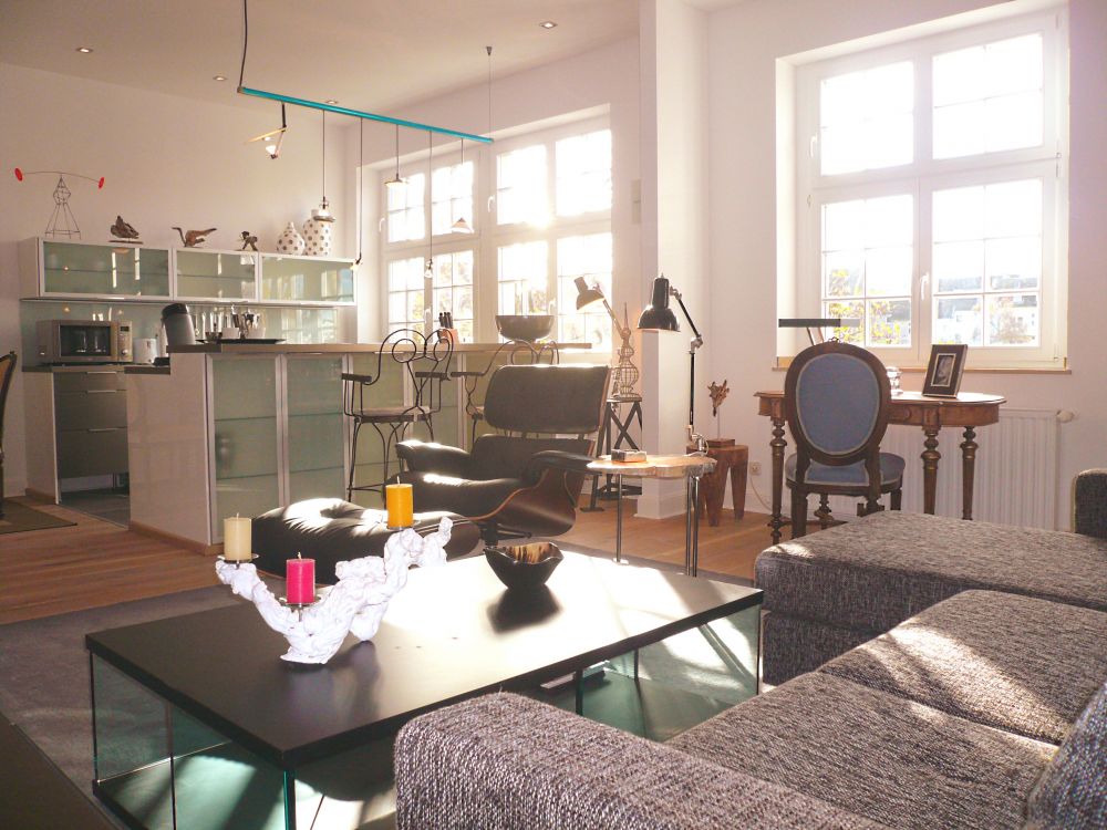 Ein Highlight der Wohnung ist der Wohnraum mit integrierter Designer-Küche und einer großen Fensterfront, die für eine Lichtdurchflutung des Raumes sorgt.