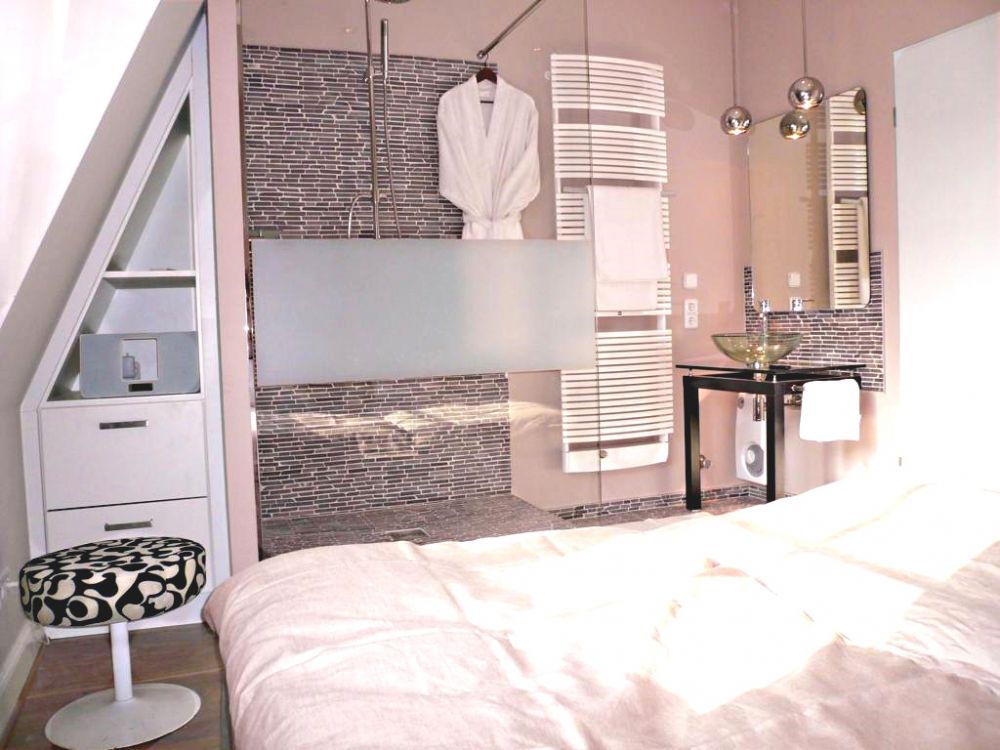 The bathroom "en Suite" is modern and timeless kept in good order. The spacious glass tropical shower is lined with small clinker bricks and gives the room a special touch.
