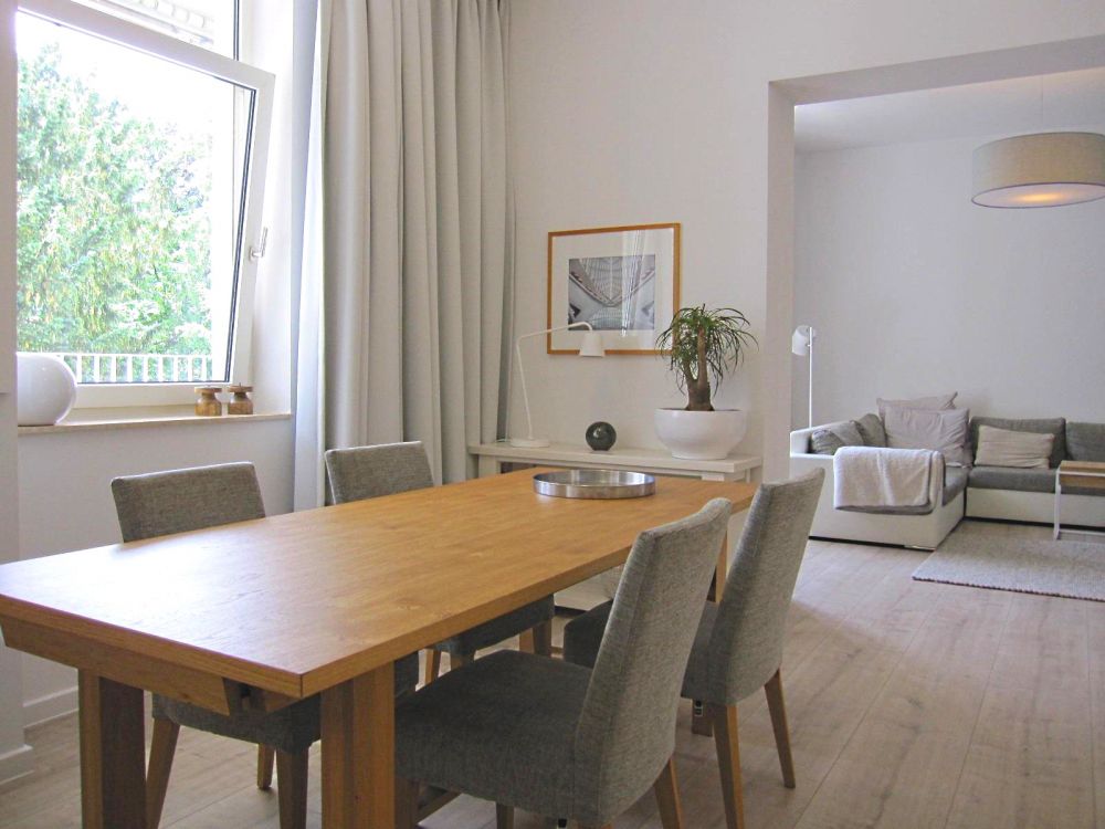 Luxus-Designer-Wohnung in Top Lage in Pempelfort. Diese außergewöhnliche Wohnung mit 2 Schlafzimmern und 2 Bädern in ruhiger Wohnstraße wird Sie begeistern. Sie wurde von einer Innenarchitektin in warmen Tönen mit ausgesuchtem Mobiliar gestaltet. Viele Extras. Wohnzimmer mit Sitzlandschaft und offen gestalteter Küche mit sämtlichen Geräten. Lange und sehr hochwertige Holzdielen werten die Wohnung zum einen optisch, als auch haptisch auf. Die ca. 3,20 m hohen Decken sorgen zudem für ein wohliges Raumgefühl. Die ca. 20 qm große und überdachte Terrasse kann man sowohl von der Küche aus, sowie vom Wohnzimmer begehen. Bodentiefe Fenster sorgen hier für viel Tageslicht. 2 große Schlafzimmer. Eines mit 1,80 m x 2,00 m großem Bett. Zweites Schlafzimmer mit zwei Einzelbetten, die man auch zusammenstellen und als Doppelbett nutzen kann. Ein Badezimmer verfügt über eine Badewanne. Das andere über eine begehbare Dusche mit Regenwaldbrause. Eine Abstellkammer mit ausreichend Stauraum befindet sich in der Diele. W-LAN. Ein Tiefgaragenstellplatz kann bei Bedarf zusätzlich angemietet werden. Ein Reinigungsservice ist optional buchbar.