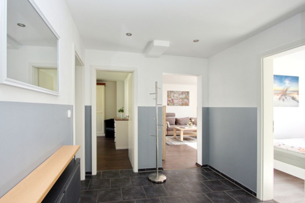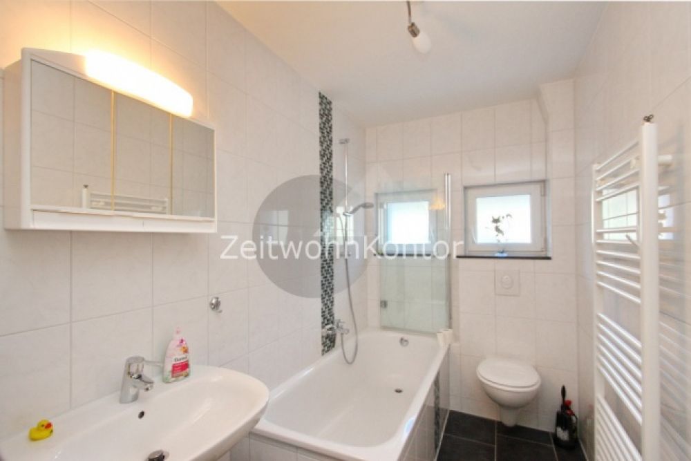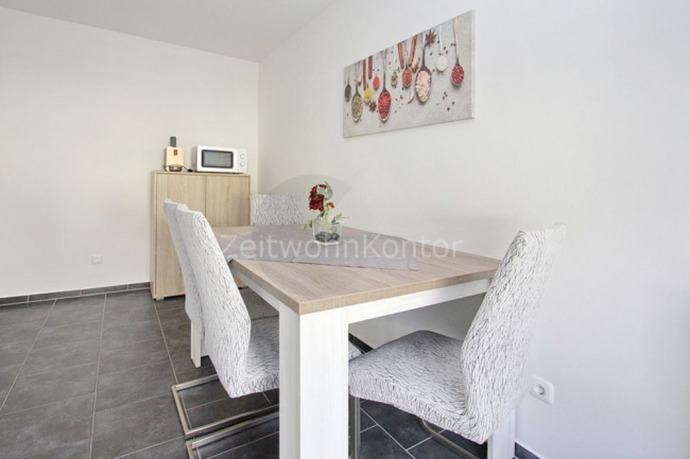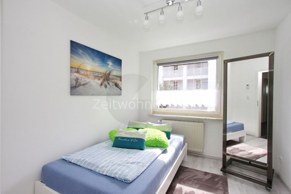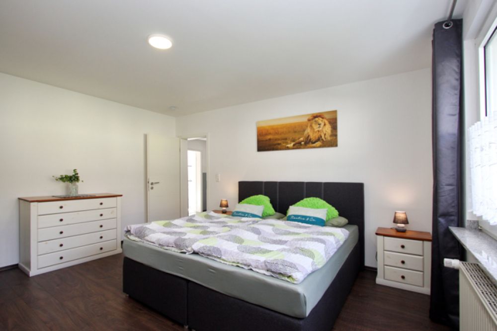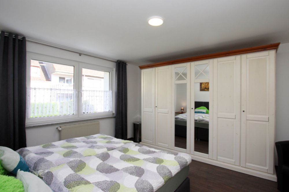 Separates Schlafzimmer mit Doppelbett und großem Kleiderschrank. Weiteres, kleines Schlafzimmer mit Einzelbett. Große Küche mit hochwertiger Einbauküchenzeile, vollausgestattet: Backofen, Ceranfeld, Geschirrspüler, Dunstabzug, Kaffeemaschine etc., Esstisch für 4 Personen. Modernes Bad mit Wanne und Duschwand, Tageslicht. Waschmaschine und Trockner im Keller des Hauses. Komplettmiete, Strom inklusive., Endreinigung € 100,-