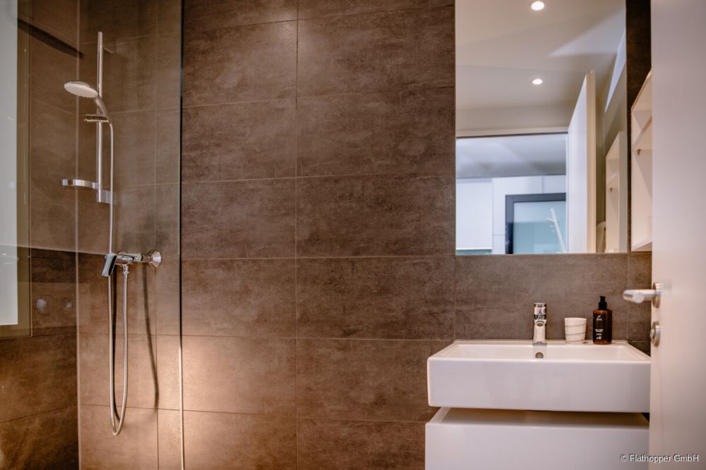 Bad mit Dusche, Haartrockner und Tageslichtfenster