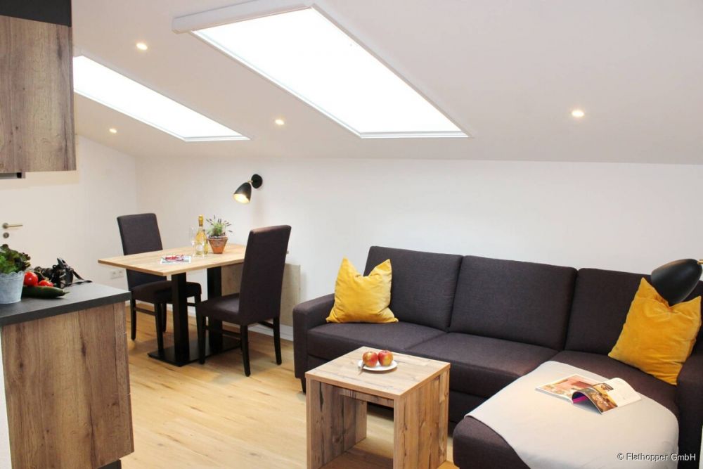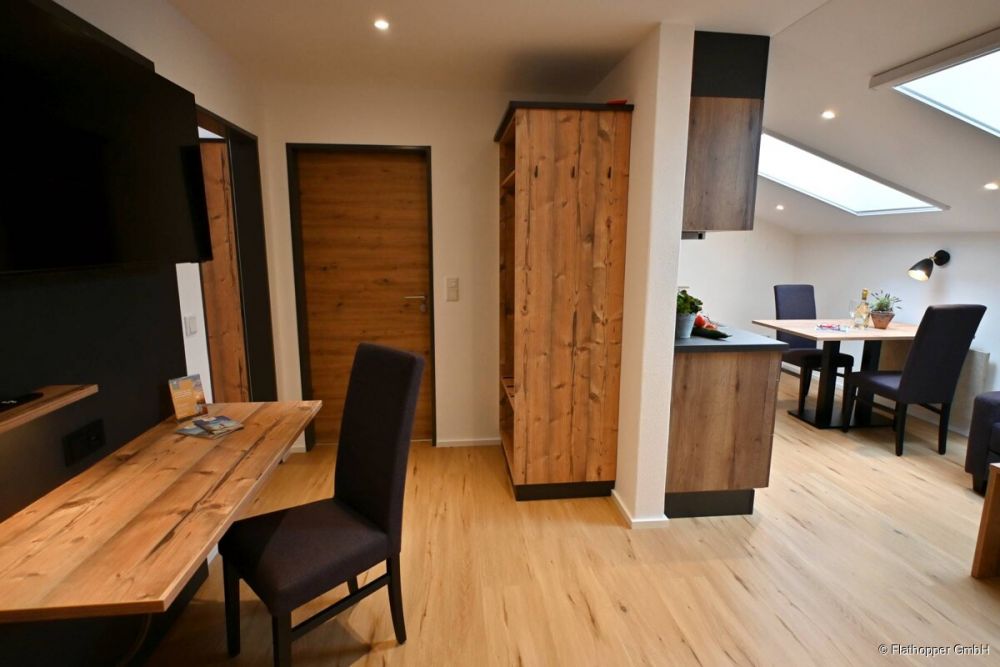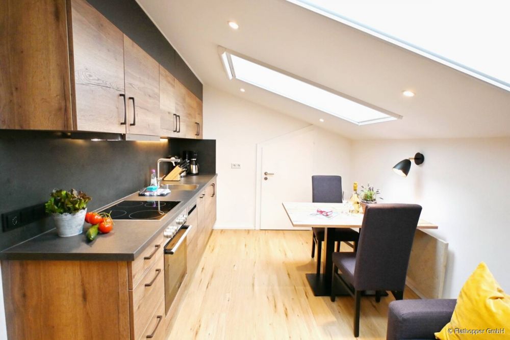 Die Wohnung bietet einen großzügigen Wohnraum, der Eingangsbereich, Garderobe, Wohn- und Essbereich sowie eine voll ausgestattete, offene Küche harmonisch miteinander vereint.