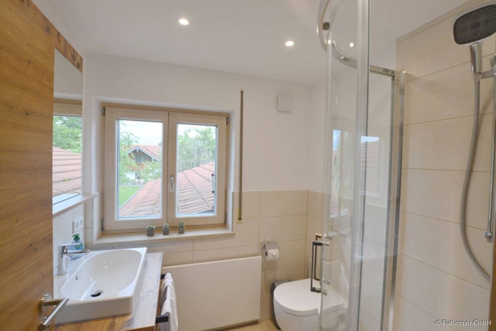 Das moderne Badezimmer ist mit einer Dusche ausgestattet.