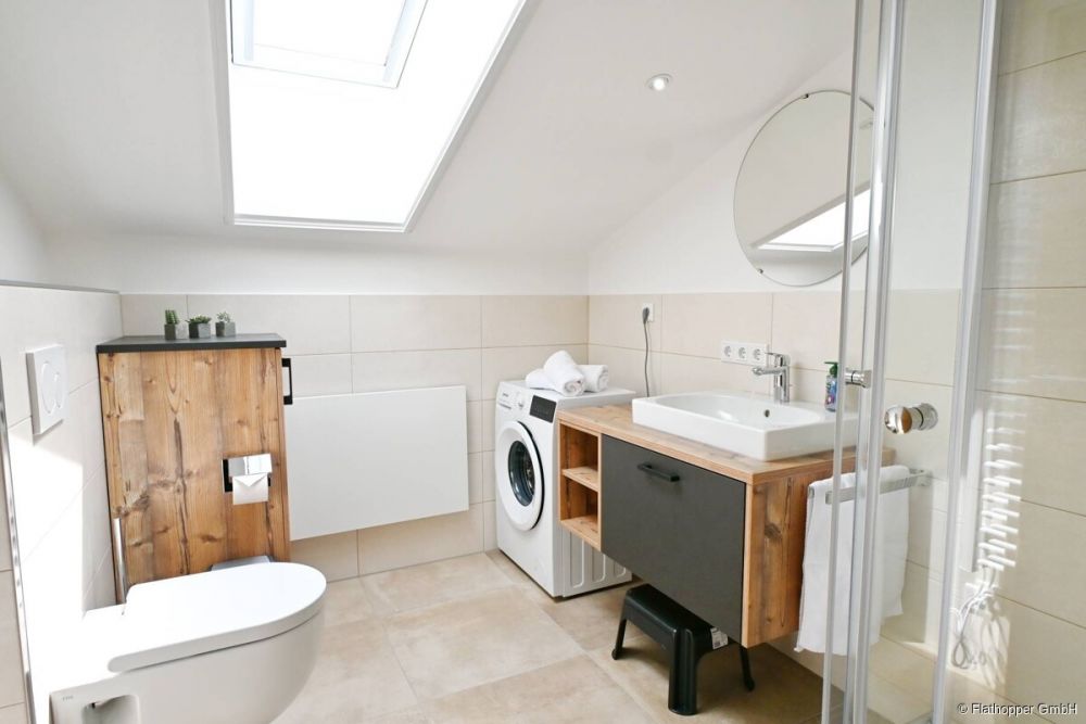 Das moderne Badezimmer mit Dusche, WC und Waschmaschine bietet alles, was Sie für einen sorgenfreien Aufenthalt benötigen.