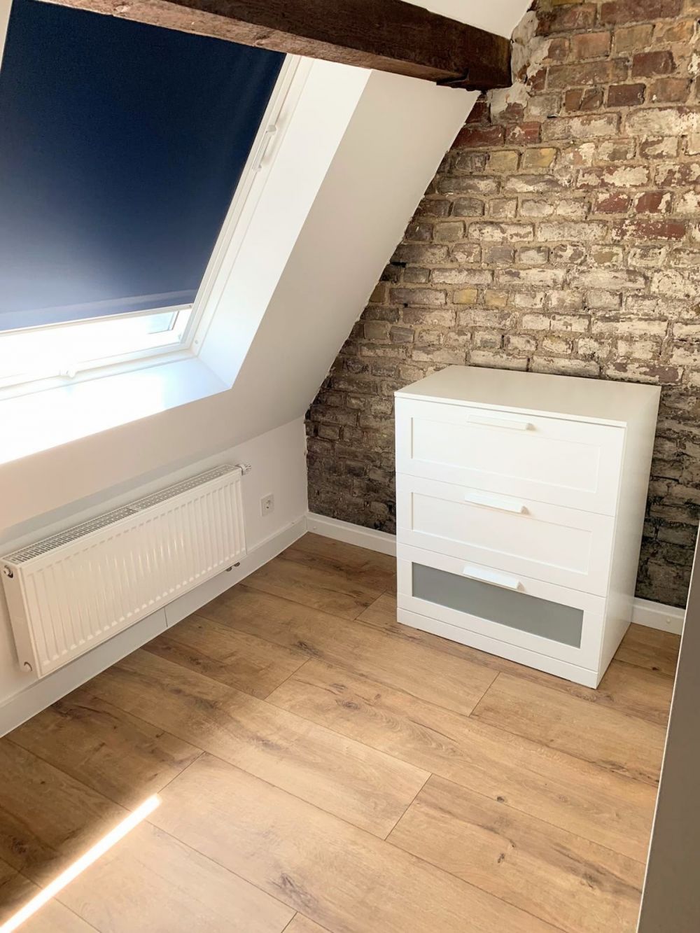 Die obere Ebene beherbergt ein zweites Schlafzimmer, ein weiteres WC sowie ein Büro. Zweites, separates WC. Ähnlich wie ein Loft. Aufgrund großer Fenster sehr hell und die, für einen Altbau typische hohe Decke und das weiße Mobiliar unterstreichen die helle und freundliche Atmosphäre. Zuzüglich Internet und Strom.