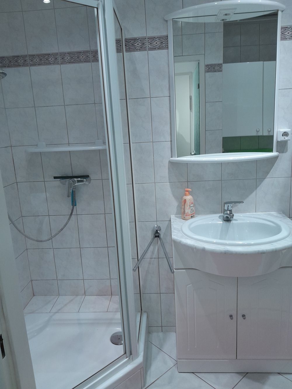 Kühl-/Gefrierkombination, Mikrowelle. Schlafzimmer mit franz.Bett 140x200 und Kleiderschrank, Badezimmer mit Dusche und Wasch-/Trockenmaschine. Die Wohnung ist mit Allem komplett ausgestattet und sofort einzugsfähig.