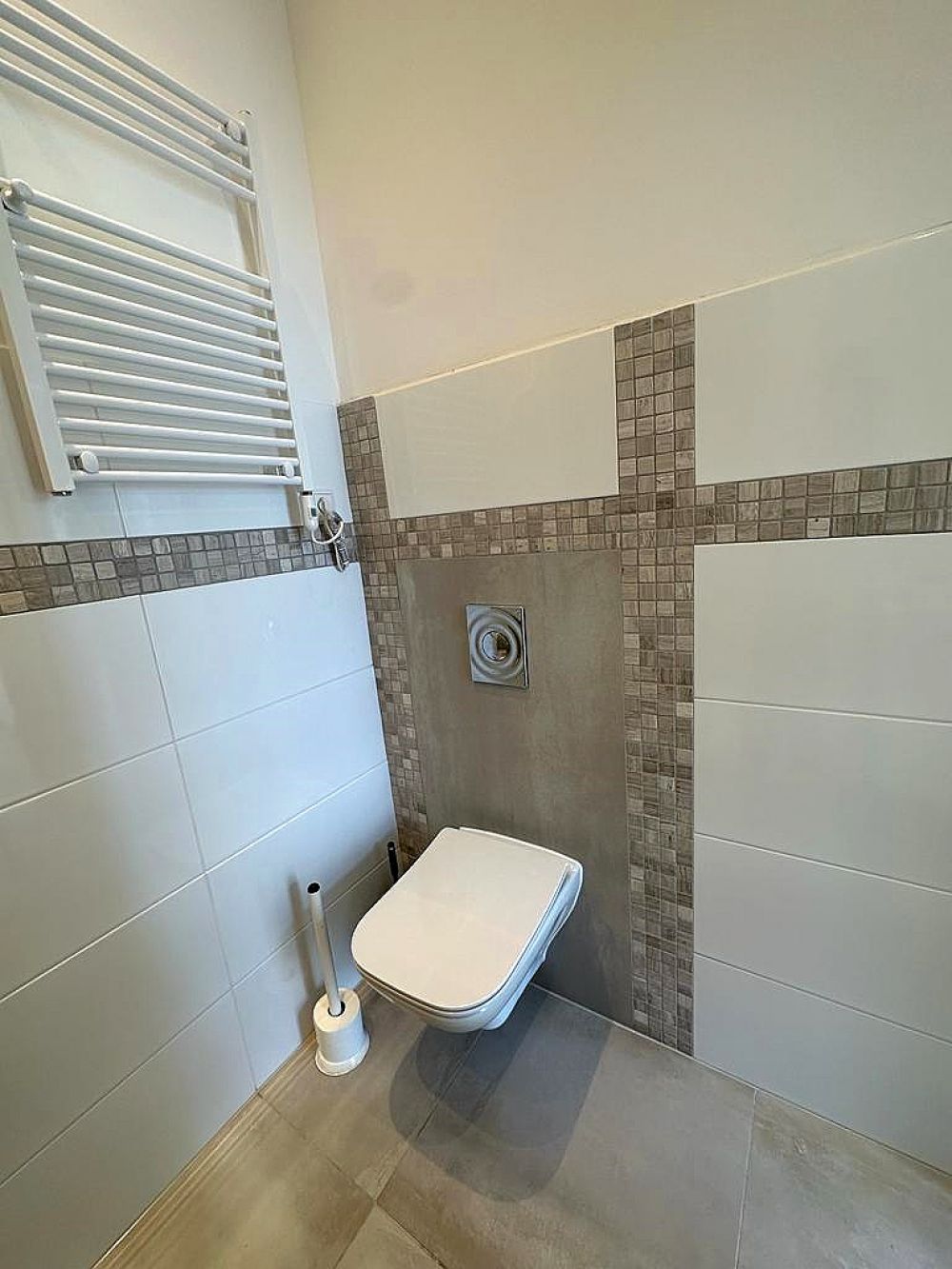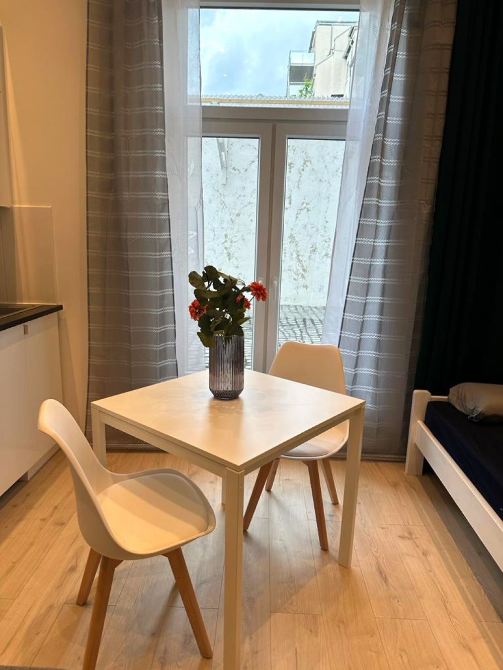 The bright living room is friendly and modern with a fully equipped fitted kitchen, a dining table, a sideboard and a bed. Floor-to-ceiling windows with access to the inner courtyard. Kitchenette with integrated washing machine. The bathroom is modernly tiled and equipped with a fully glazed shower and a washing machine. W-LAN is included. Electricity is to be paid separately. A parking space in the parking garage approx. 100m away can be rented separately from the operator of the parking garage if required. The apartment offers contemporary comfort and very good value for money.