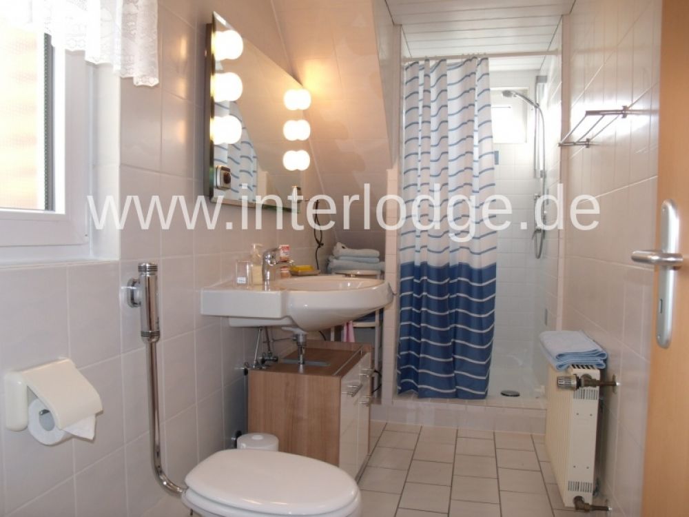 Das hell gefliesste Duschbad hat Tageslicht. Eine Waschmaschine im Tiefgeschoß kann genutzt werden.