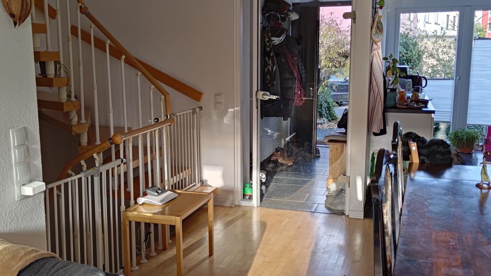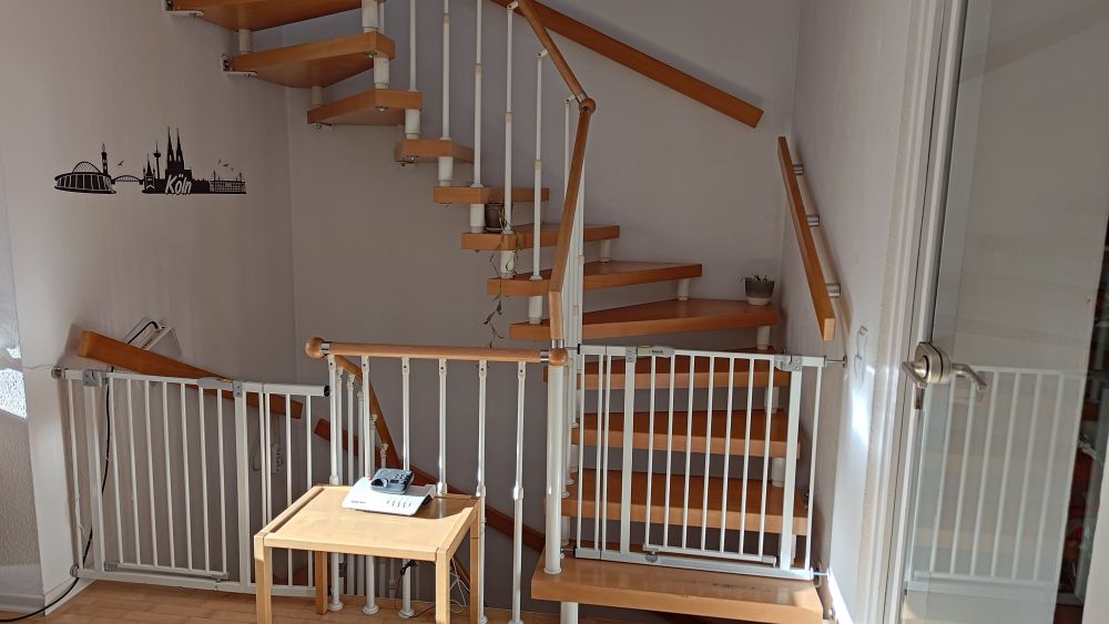 Offene Treppe ist für unsere Einjährige mit Gitter gesichert - kinderfreundliche Umgebung, Spielplatz 100 Meter entfernt.