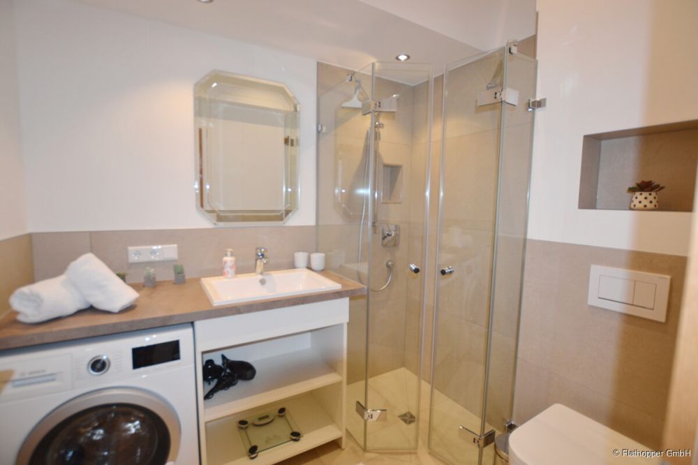 Das Badezimmer ist mit Dusche, Waschmaschine und WC versehen.