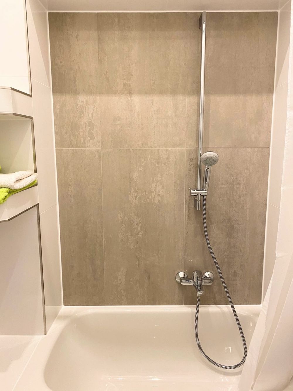 Modernes Badezimmer mit verglaster Dusche und Waschmaschine. Inklusive W-LAN Internet. Strom extra. TG Stellplatz möglich. Sehr gutes Preis-Leistungs-Verhältnis!
