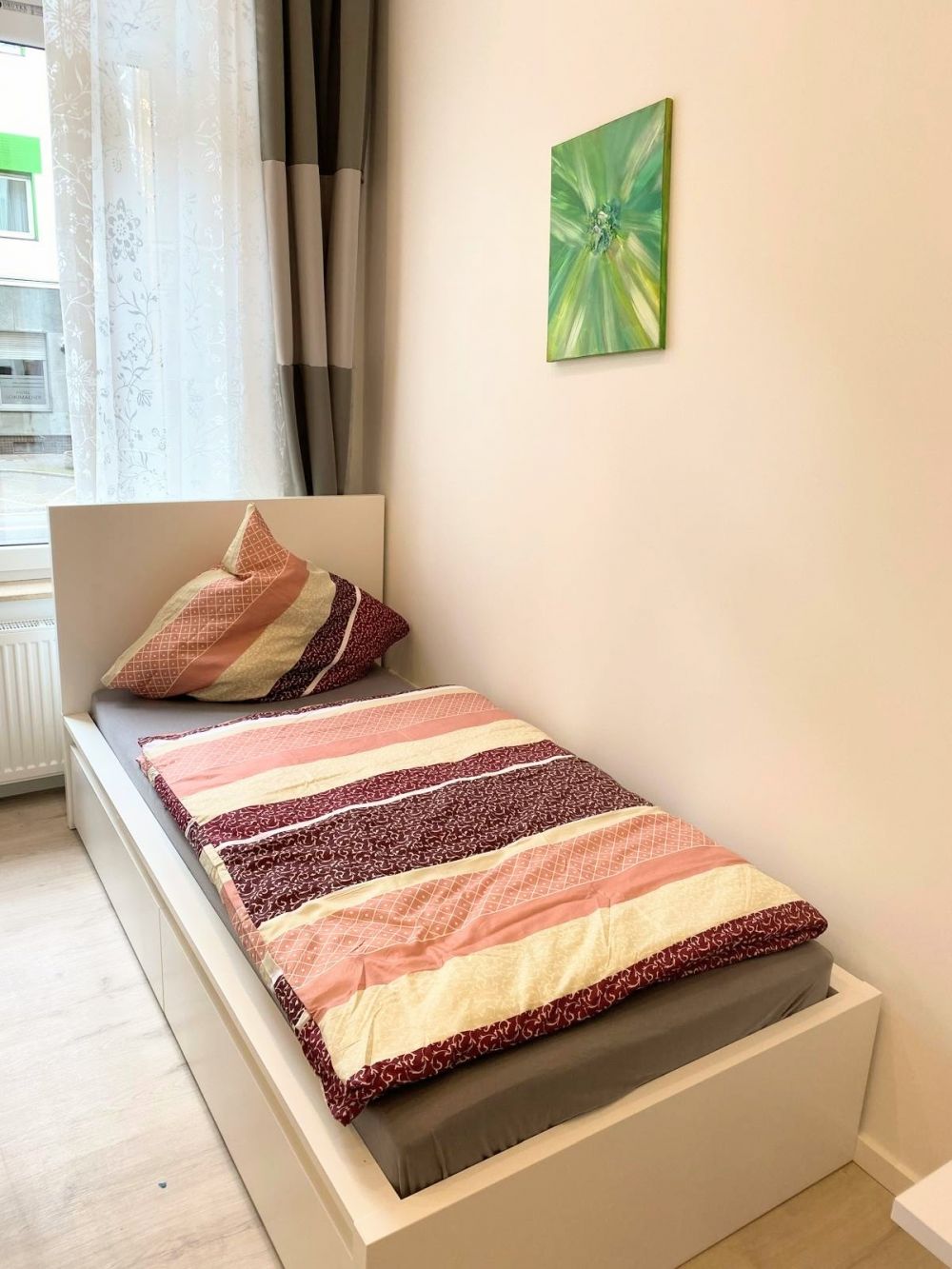 Schadowstraße/ Grafenberger Allee: Cozy and modern furnished 1-room apartment in a completely renovated apartment building. High ceilings ( 3,8m ! ) with great sense of space, parquet floor, smooth plastered walls. Open kitchen with electric stove, ceramic hob and microwave, as well as a dining table with chairs. Living area with sofa, flat screen TV and chest of drawers. Sleeping area with single bed.