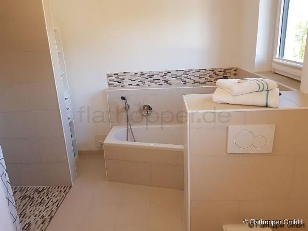 Ein großes, helles Badezimmer mit begehbarer Dusche und zusätzlicher Badewanne steht den Gästen im Obergeschoss zu Verfügung.