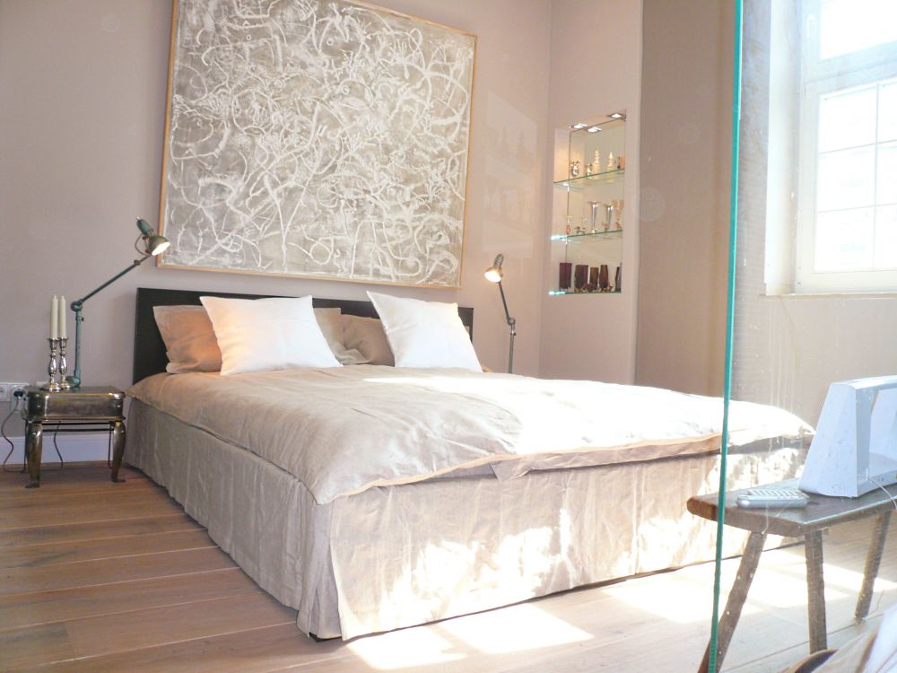 The "en suite" bathroom is modern and timeless. The spacious glass tropical shower is lined with small clinker stones and gives the room a special touch.