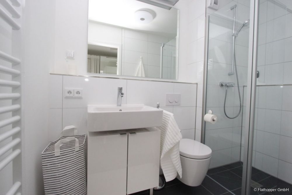Im modernes Badezimmer befindet sich eine große Regendusche mit Glasabtrennung. Stauraum ist durch den Waschbeckenunterschrank und Spiegelschrank gegeben.