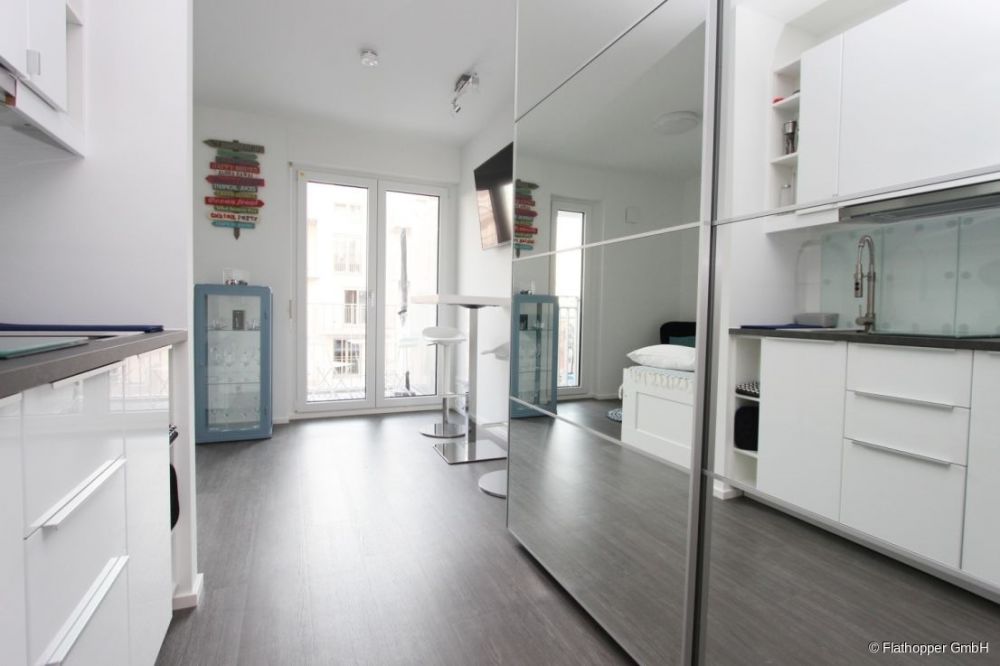 Über das moderne und heller Wohn-/ Schlafbereich gelangt man zum großzügigen Balkon. Dieser bietet eine tolle Aussicht auf die Leopoldstraße bis zum Olympiaturm und BMW.