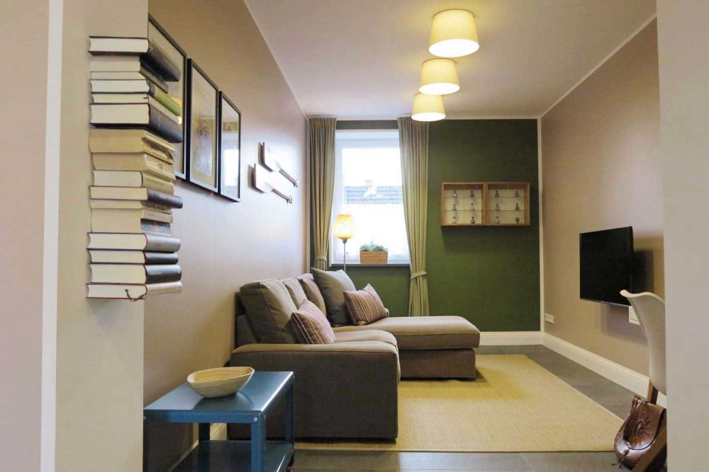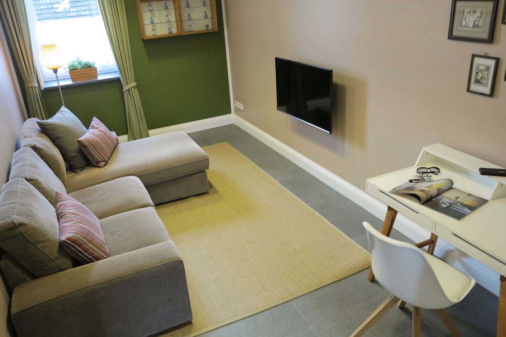 - Wohnzimmer mit Sofa, TV und kleinem Schreibtisch