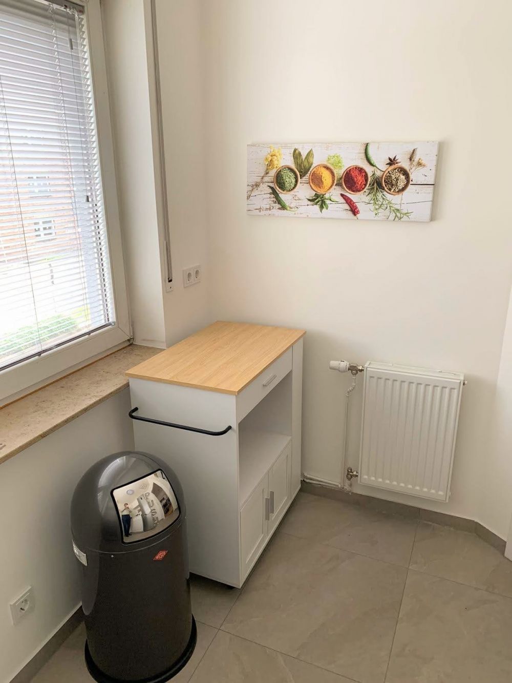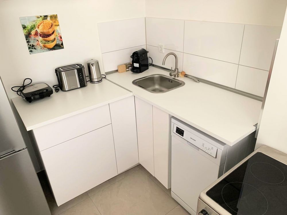The living room is furnished with a sofa, an armchair, small pieces of furniture and a dining area with a large table and 4 chairs. The bedroom has a king-size bed and a large wardrobe with plenty of storage space. The kitchen is equipped with all electrical appliances. A washing machine has been integrated into the bathroom. Internet and electricity are to be paid separately.