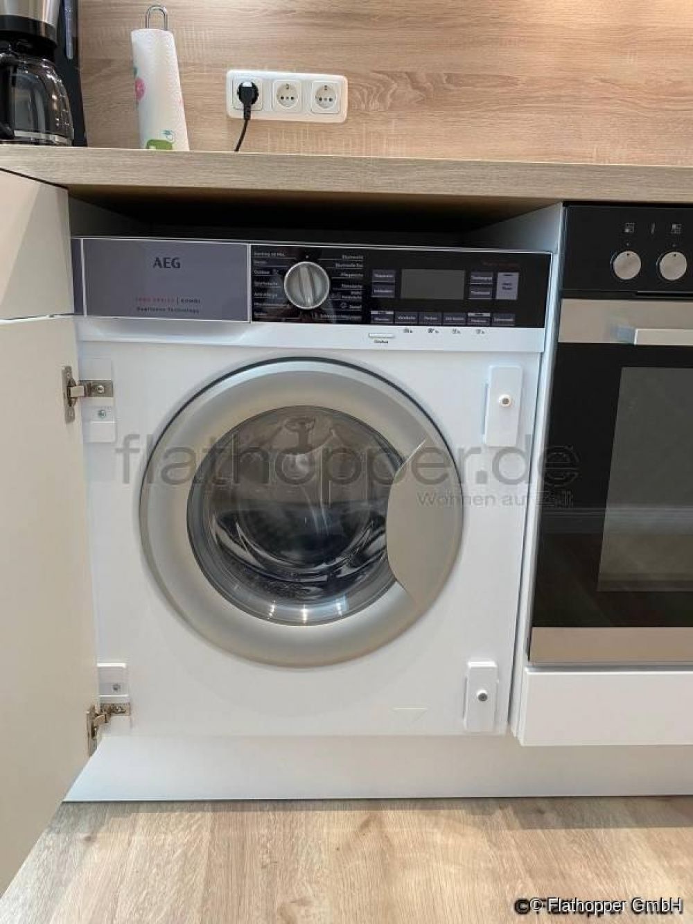 Küche in weiss matt, mit Arbeitsfläche im Eichendesign, ausgestattet mit Waschtrockner, Mikrowelle, Back/Herd, Geschirrspüler und Kühlschrank.