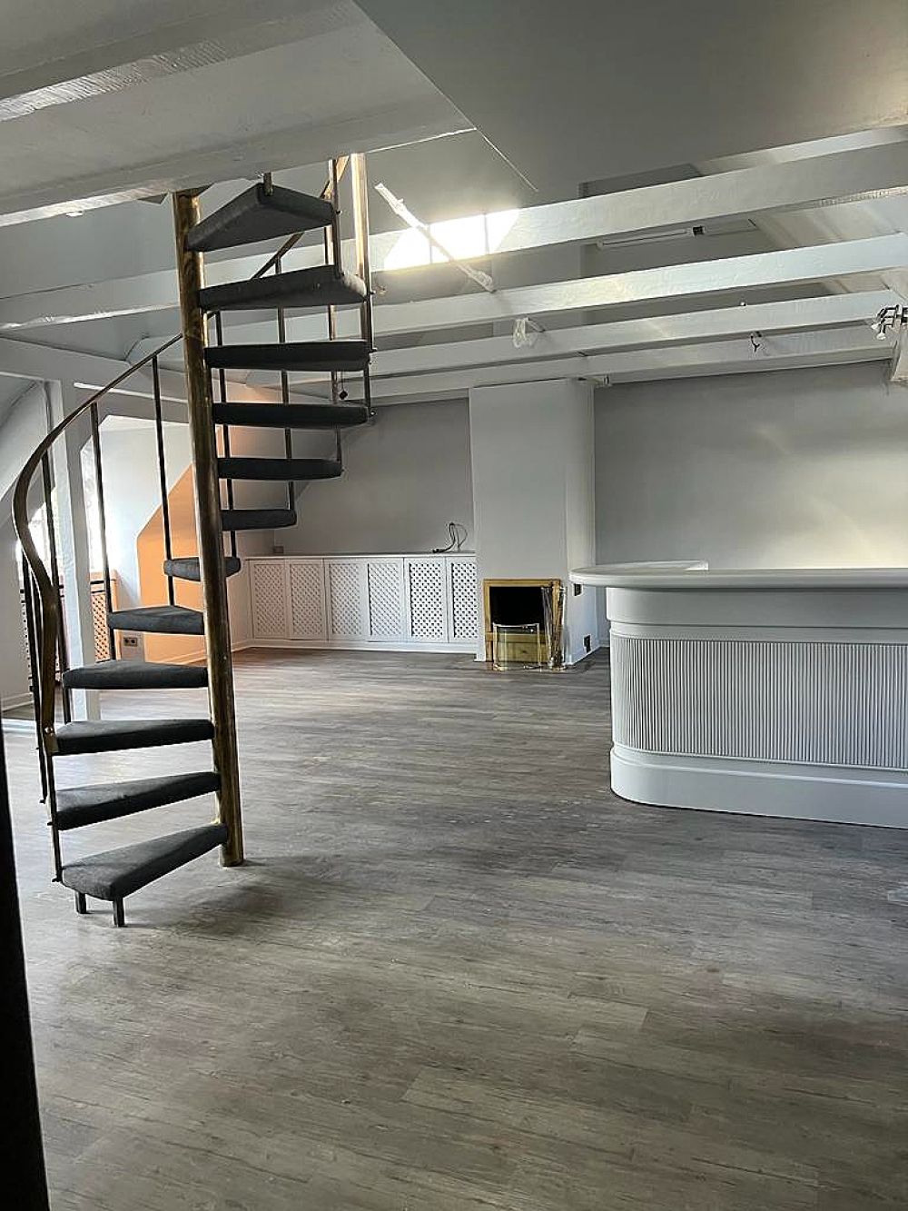 Über eine Wendeltreppe gelangt man in die obere Etage. Dort befindet sich ein weiterer Raum mit Blick über die Dächer der Düsseldorfer Altstadt. Ein perfekt integrierter Einbauschrank bietet zudem weiteren Stauraum. Zusätzliches Bonbon ist die integrierte Klimaanlage.
