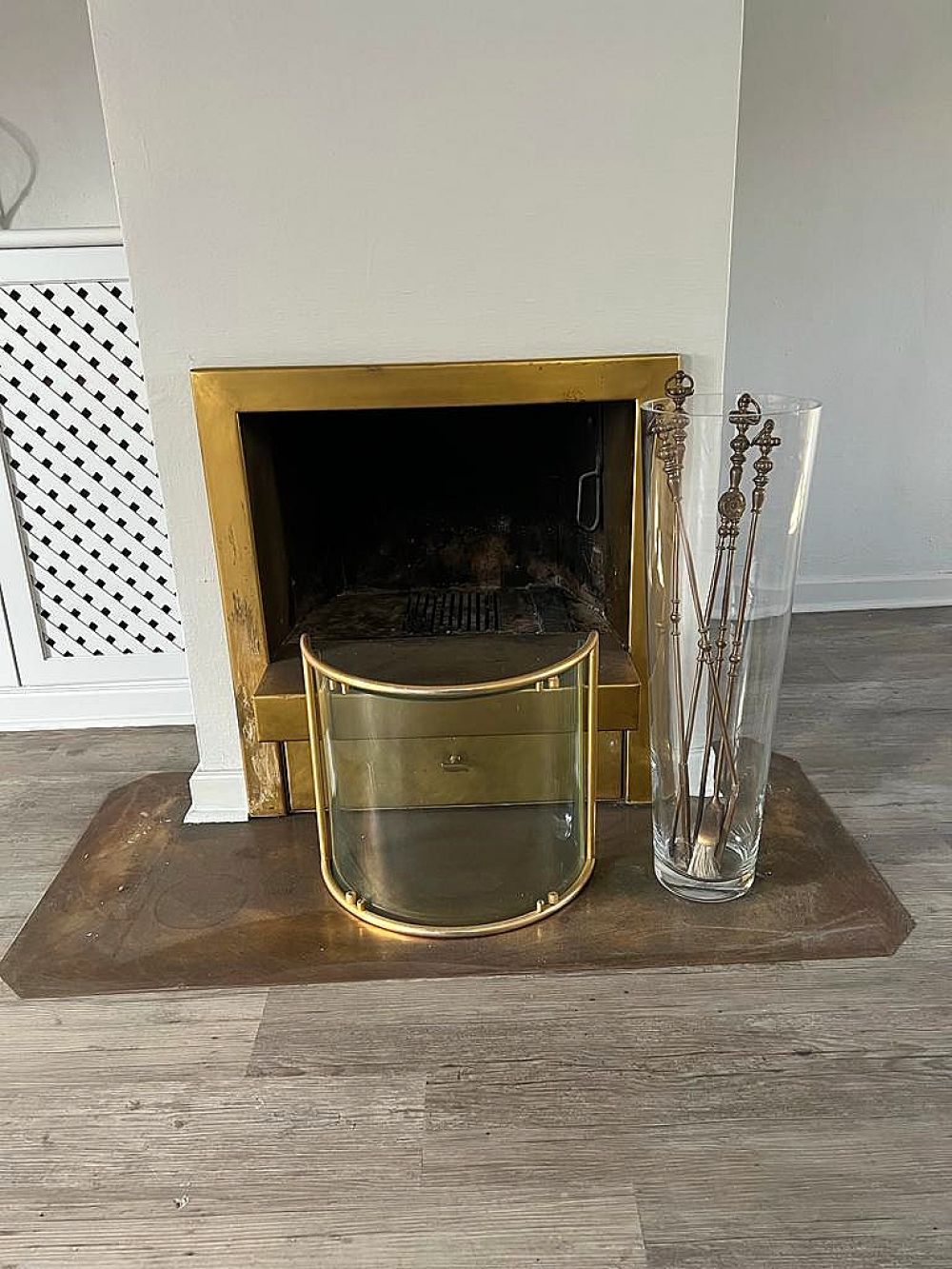 The open and light-flooded living room features high ceilings, a marble fireplace, and an adjoining, new, high-quality kitchen with brand-name appliances and a counter. Large mirror elements make the room appear even more spacious and brighter.