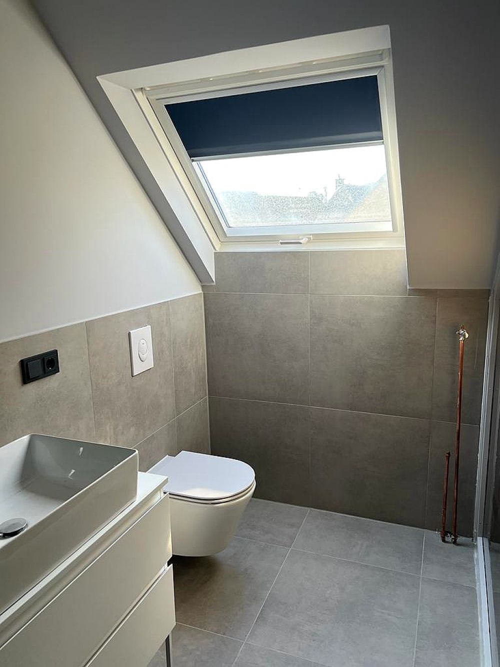 The completely new bathroom with natural light is modernly tiled and equipped with a fully glazed shower.