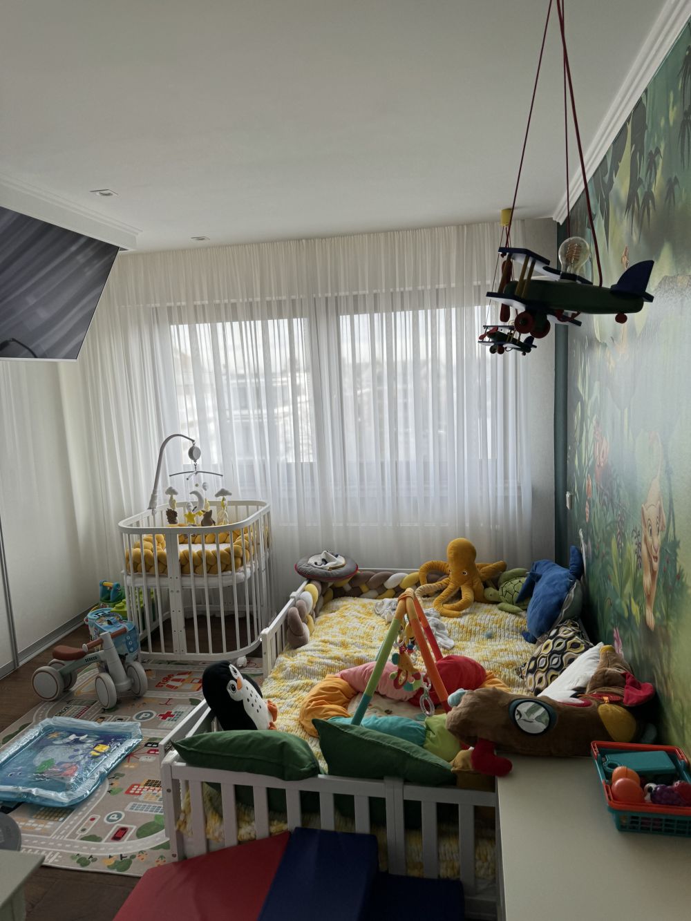 -Doppelbett + große Couch + Luftmatratzen-Doppelbett.