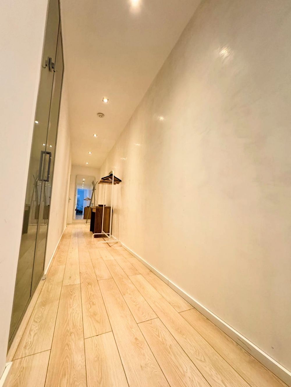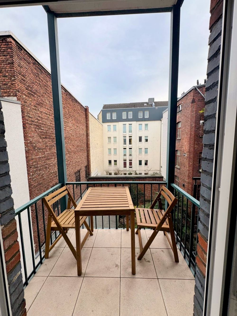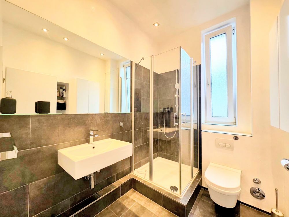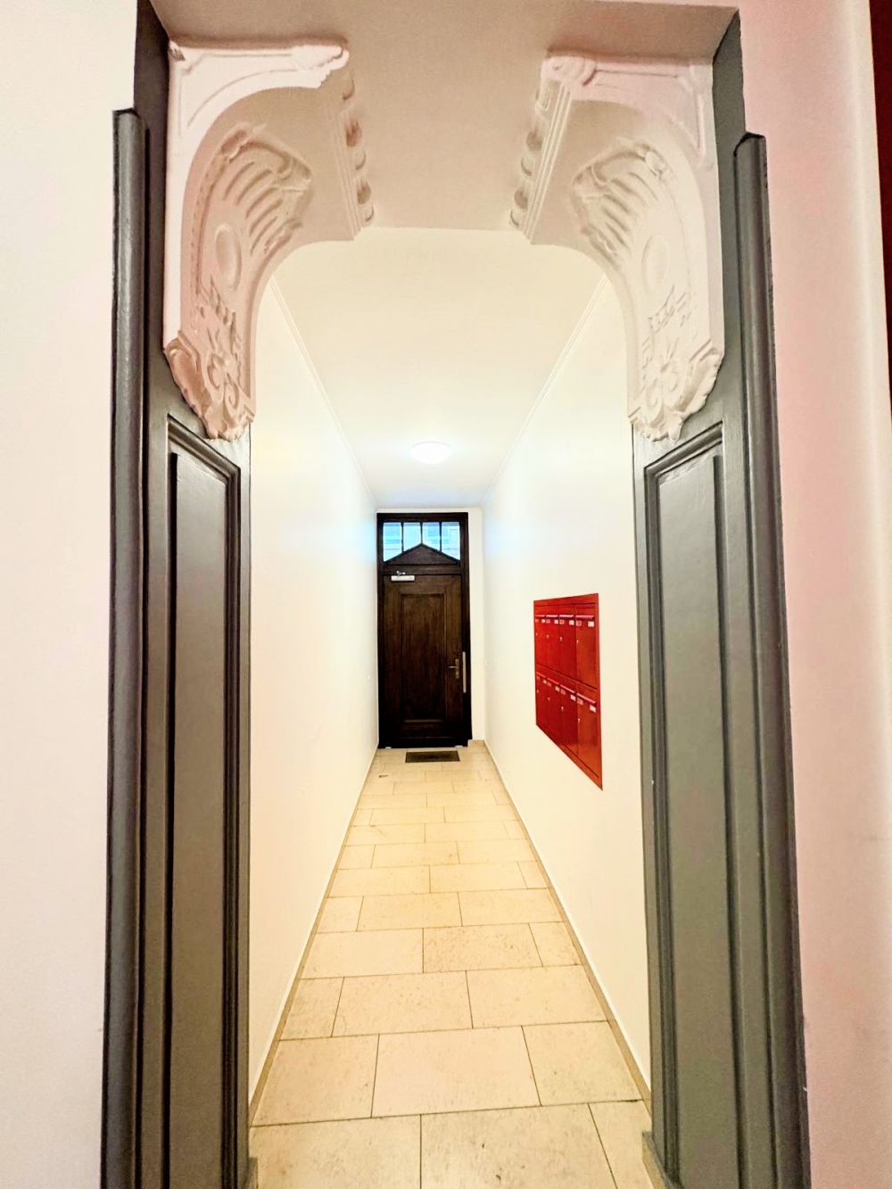 This high-quality, furnished apartment is located in a prime setting on a beautiful, quiet side street just off the highly sought-after Lorettostraße. The well-maintained period building impresses with its excellent condition and charming character. The apartment is situated on the second floor and is entirely oriented toward the peaceful inner courtyard.Typical of period properties, the high ceilings create a spacious sense of openness and emphasize the exceptional living comfort. The perfectly smooth walls, finished in premium Stucco Italiano, lend the rooms an exclusive and modern appearance. From the entrance hall with wardrobe area, one accesses a floor-to-ceiling, generously sized built-in closet offering ample storage space for clothing and personal belongings. The hallway also provides access to the comfortable, high-end bathroom, which features a shower and a window. Indirect ceiling lighting throughout the apartment creates a warm and inviting living atmosphere.