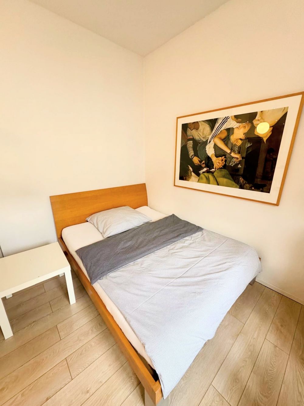 Der kombinierte Wohn- und Schlafraum ist geschmackvoll möbliert und verfügt über eine hochwertige Einbauküche, einen stilvollen Glastisch mit vier Stühlen sowie einen räumlich abgetrennten Schlafbereich mit Doppelbett. Ein Schreibtisch bietet sich ideal fürs Homeoffice an. Große Fensterflächen gewährleisten viel Tageslicht und bieten Zugang zum zum Innenhof gelegenen Balkon, der zusätzliche Ruhe und Erholungsqualität bietet.