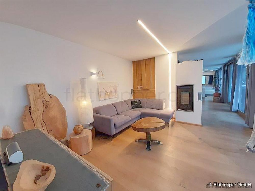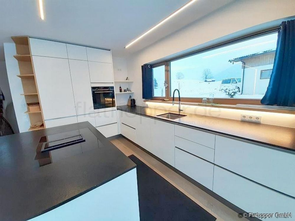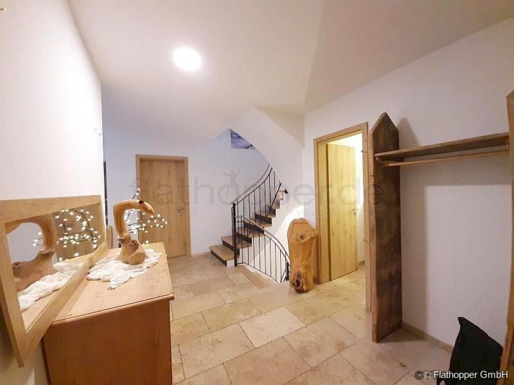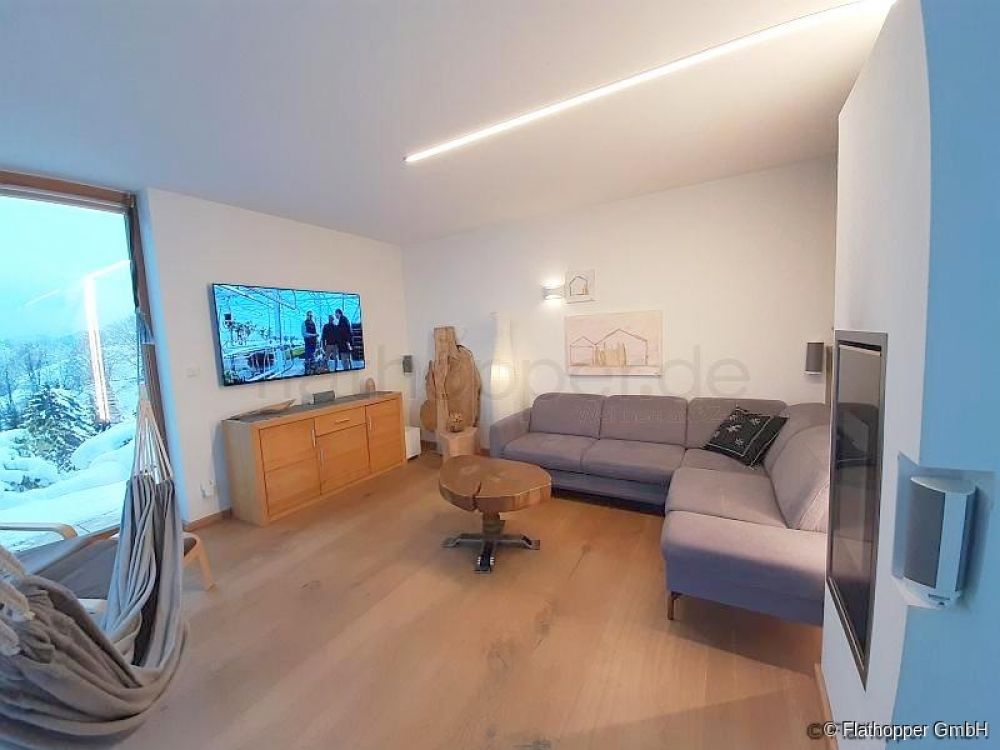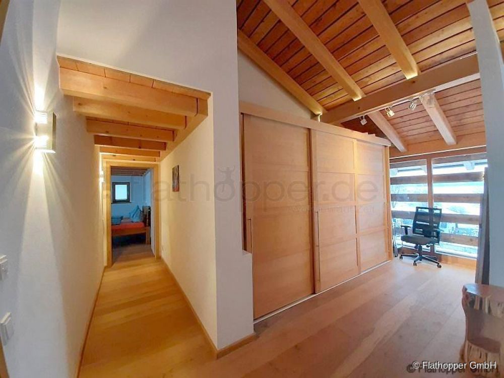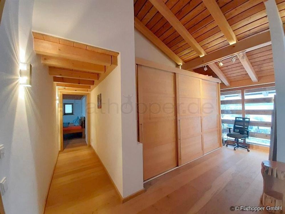 Durch die durchgängige Fensterfront bietet sich ein unglaublicher Blick ins Leitzachtal. Das Gefühl sich direkt in der Natur zu befinden wird unterstützt durch das hochwertige Eichenholzparkett, Echtholzmöbel und Holzskulpturen welche eine angenehmes Raumklima schaffen.
