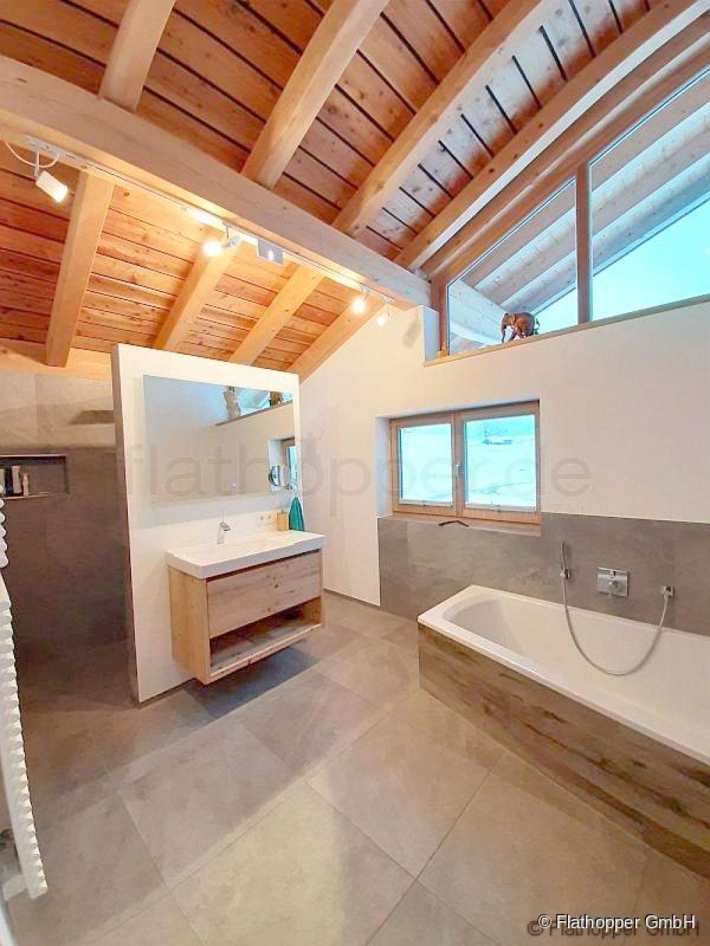 Modernes Badezimmer im OG mit großer Badewanne, gemauerter Dusche, WC, Badschrank und Waschtisch.