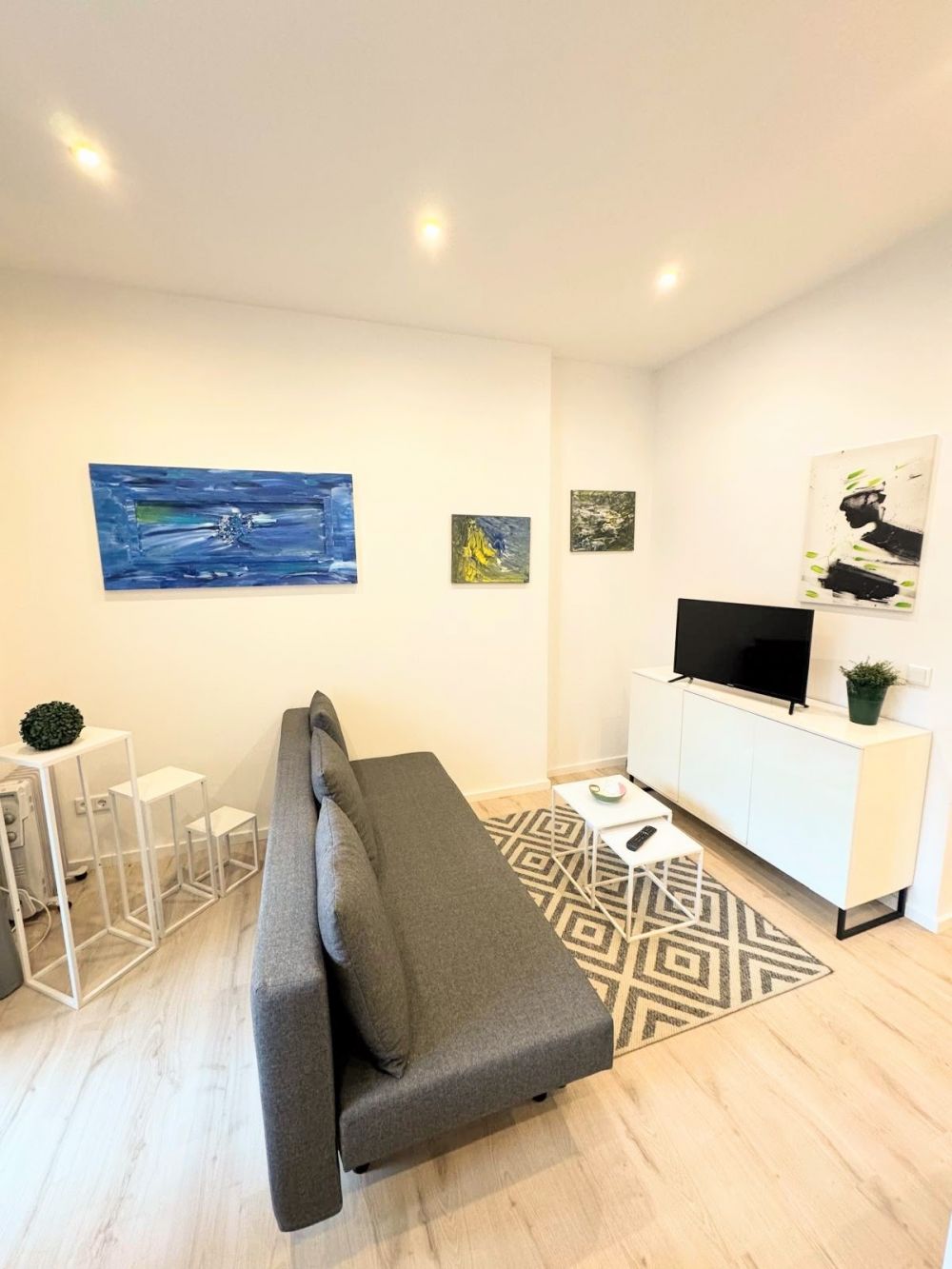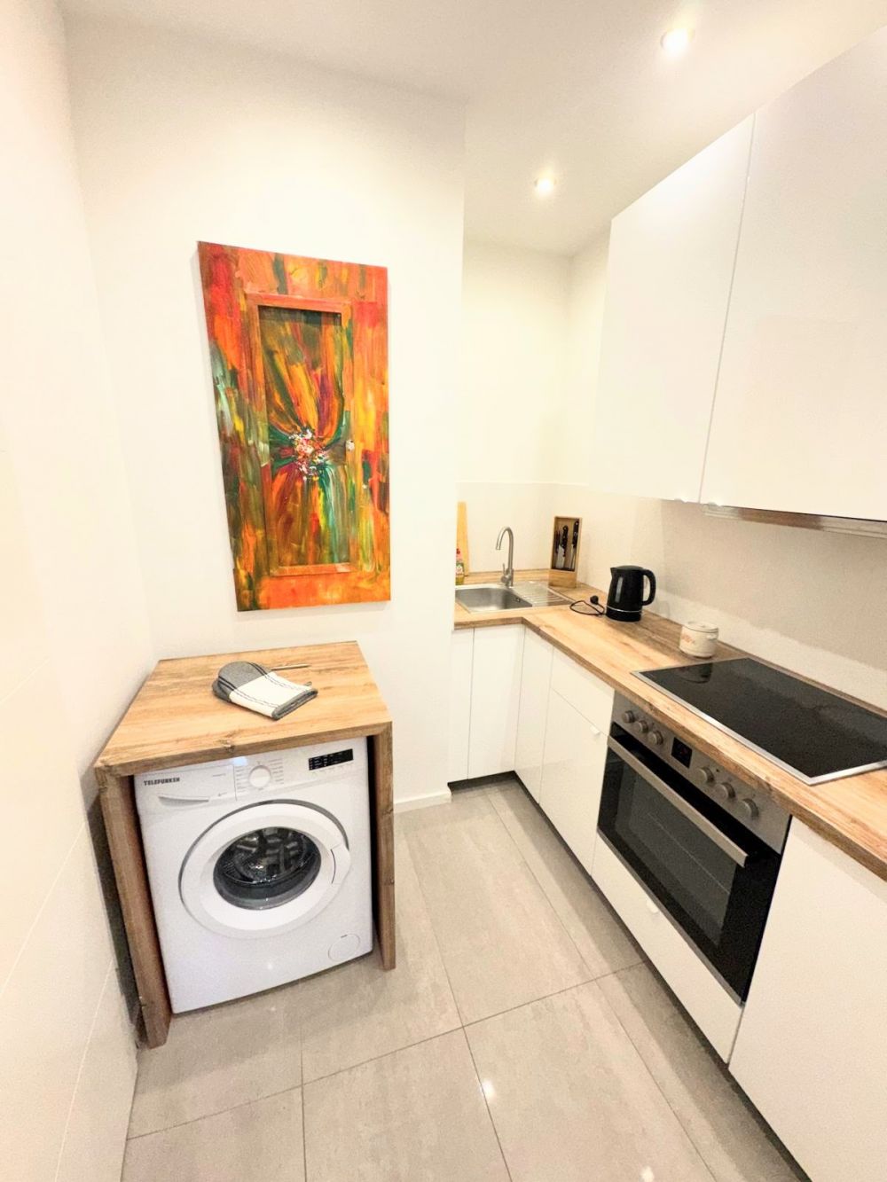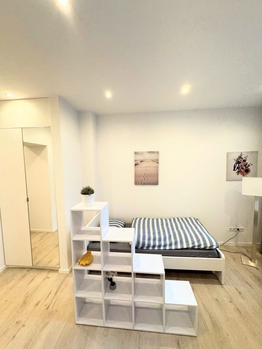 Schadowstraße/ Grafenberger Allee: Beautiful, modern furnished 1-room flat in a completely refurbished apartment block. High ceilings ( 3,8m ! ) with great sense of space, parquet floor, smooth plastered walls. Open-plan kitchen with electric cooker, ceramic hob and microwave, washing machine and a dining table with chairs. Living room with sofa, flat screen TV and chest of drawers. Bed with mattress.