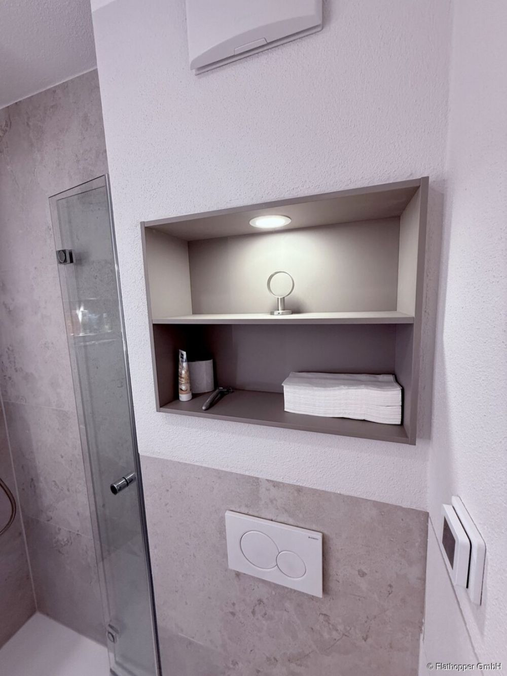 Ein schickes Bad mit Fußbodenheizung, Tageslicht über ein Lichtband, Handtuchwärmer, Fön, AXOR Wandarmaturen Rainshower beleuchtete Nischen und Toilette mit Tornadoflash und Geruchsabsaugung lässt keine Wünsche offen.
