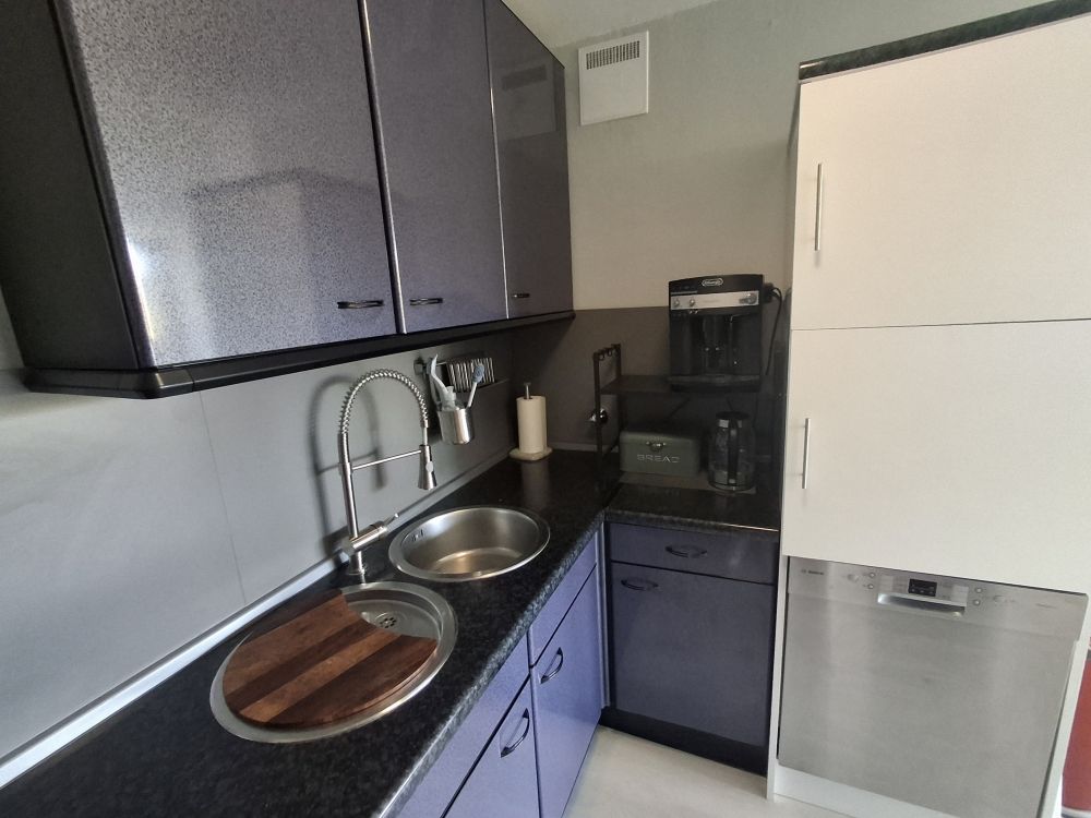 Hochwertige Küchengeräte: Backofen, Induktionsherd, Dunstabzugshaube, großer Kühlschrank, Geschirrspüler