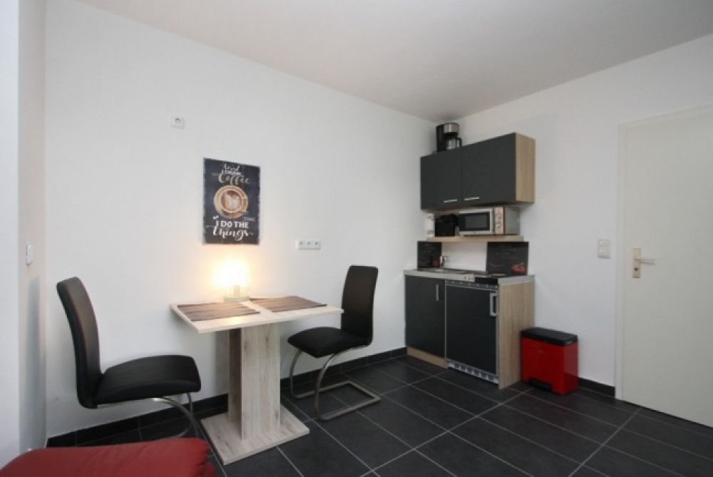 Wohn-/Schlafraum mit Sofa, Glascouchtisch, Flachbild-TV mit digitalem SAT-Empfang, Laminatboden, Rollläden, offene Single-Einbauküche, Esstisch für 2 Personen.. Schlafzimmer mit 2 Einzelbetten und Kleiderschrank. Modernes, weiß gekacheltes Badezimmer mit Dusche und Waschmaschine. Handtücher und Bettwäsche werden gestellt. Reinigungsservice gegen Aufpreis möglich. Kleiner Terrassenplatz mit Blick in den Garten steht zur Nutzung zur Verfügung, ebenso Gartennutzung..Strom extra.