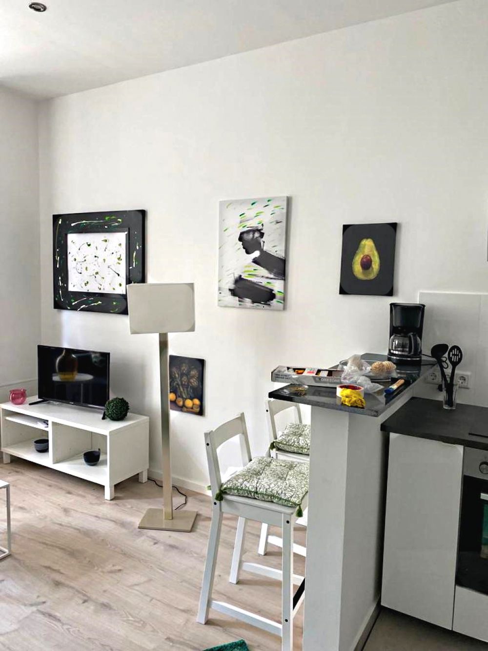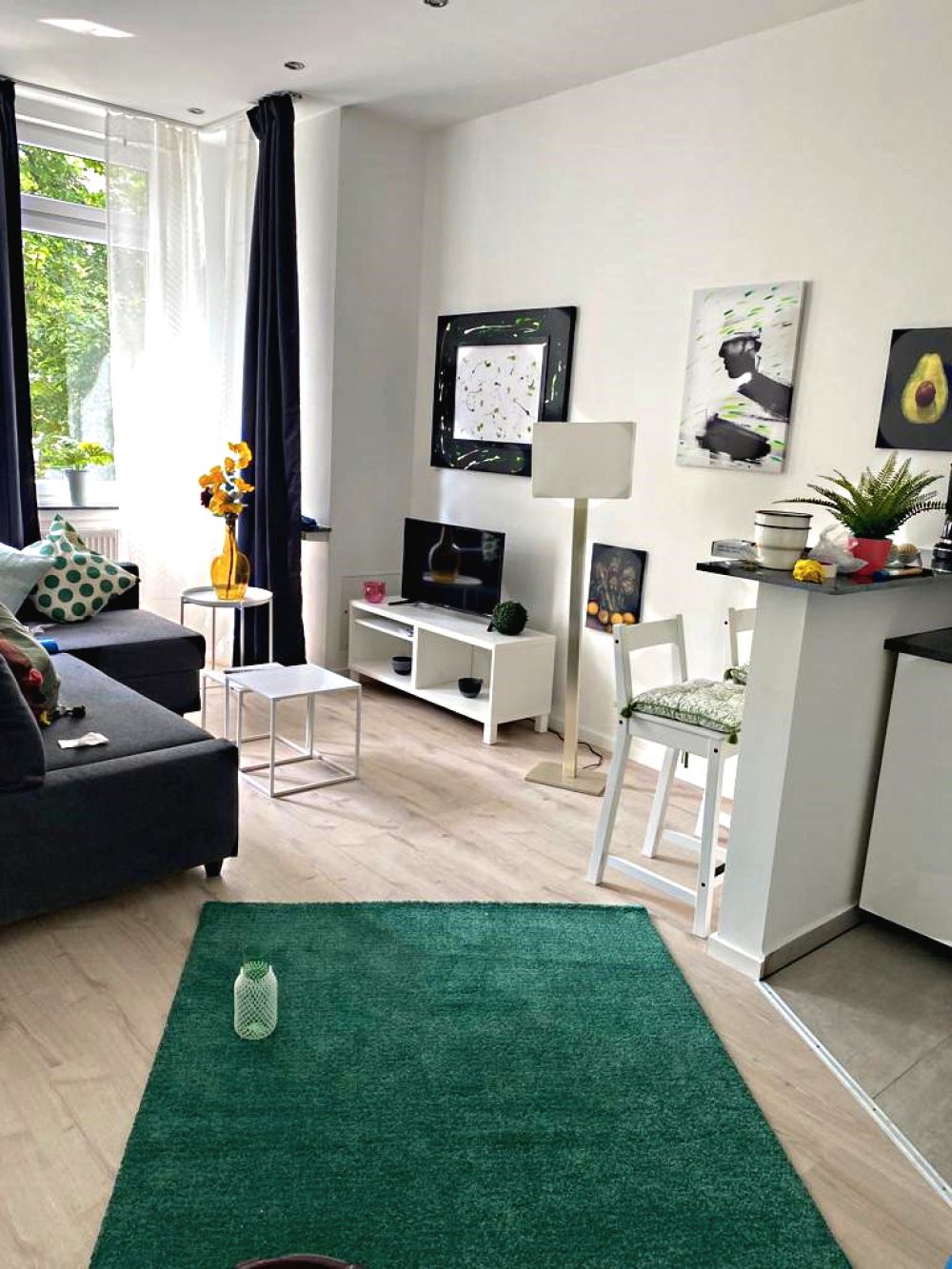 Moderne Wohnung im Zentrum Ecke Schadowstraße/ Grafenberger Allee. Eine helle, zeitgemäß und liebevoll eingerichtete Wohnung in der 1. Etage mit Aufzug in einem komplett sanierten Mehrfamilienhaus. Offene Wohnküche mit Theke, ausgestattet mit Elektroherd, Ceran-Kochfeld, Kühlschrank und Mikrowelle. Wohnraum mit Ecksofa ( Schlafcouch ), Flachbildschirm-TV und TV-Tisch. Bodentiefe Fenster, die 3,2 m hohen Decken, glatt verputzte Wände, Deckenfluter und die moderne Möblierung harmonieren wunderbar und bieten Raumgefühl und Wohnkomfort.